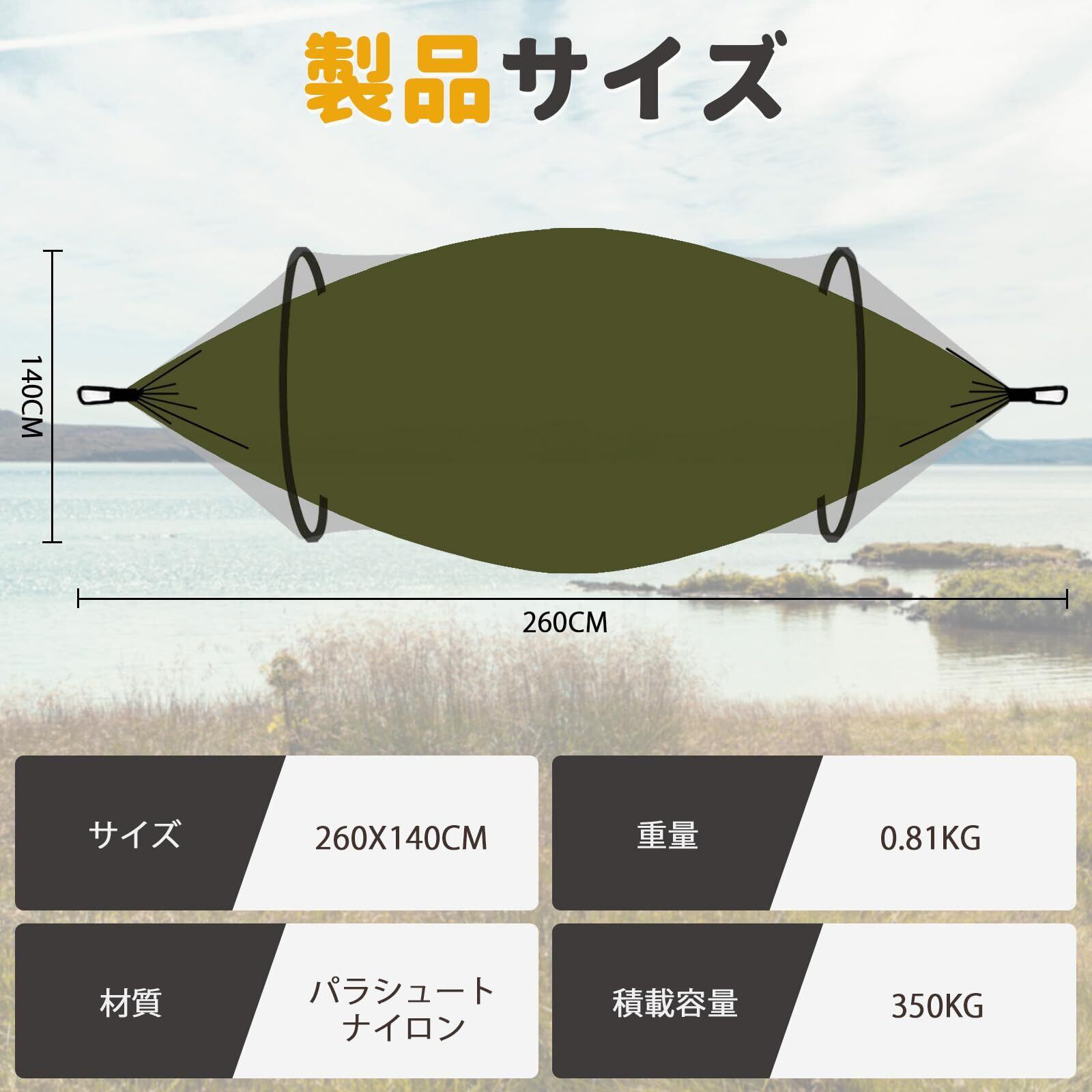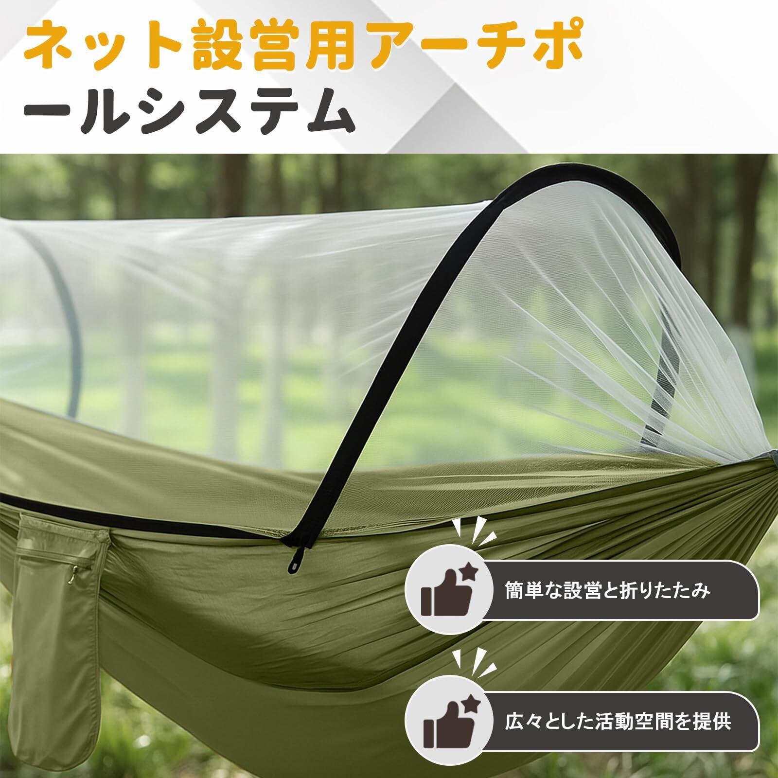 ハンモック 屋外 キャンプ ハンモック 蚊帳付き 通気 ポータブル 全自動クイックオープン 多機能 軽量 便利 旅行 ハイキング 野営 公園 260*140CM 350kg荷重 収納袋付き (ミリタリーグリーン)
