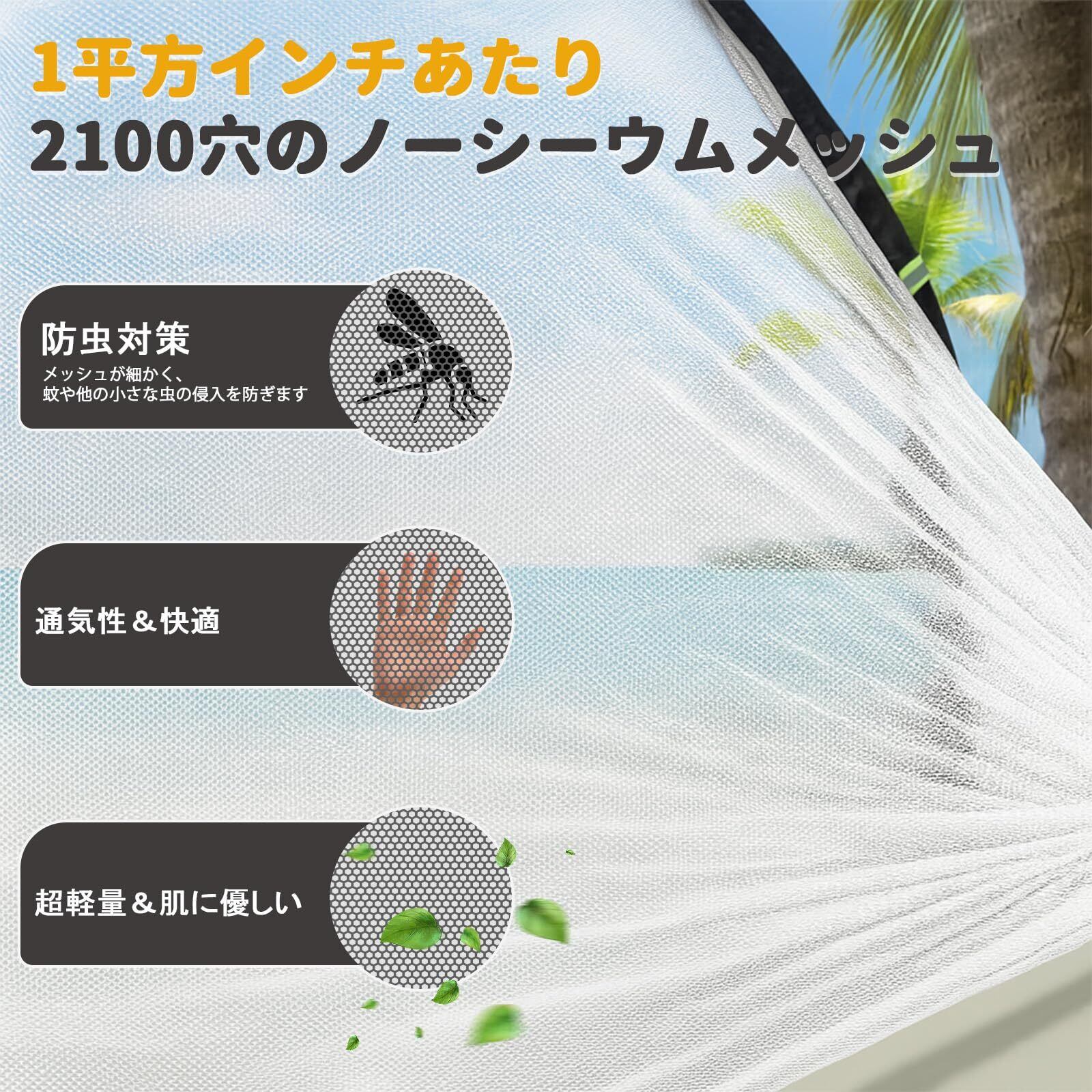 【一体化設計、防虫で快適】ハンモックと蚊帳が一体化された設計で、別途蚊帳を設置する必要がなく、使用が非常に便利です。360°の高密度メッシュが虫除けと通気性を兼ね備え、安全で快適な休息環境を提供します。ハンモックはナイロン素材を使用しており、手触りが軽くて薄く、肌に優しく、厚みがあり丈夫です。キャンプ、ハイキング、釣り、ビーチなど多彩な屋外シーンに対応しています。