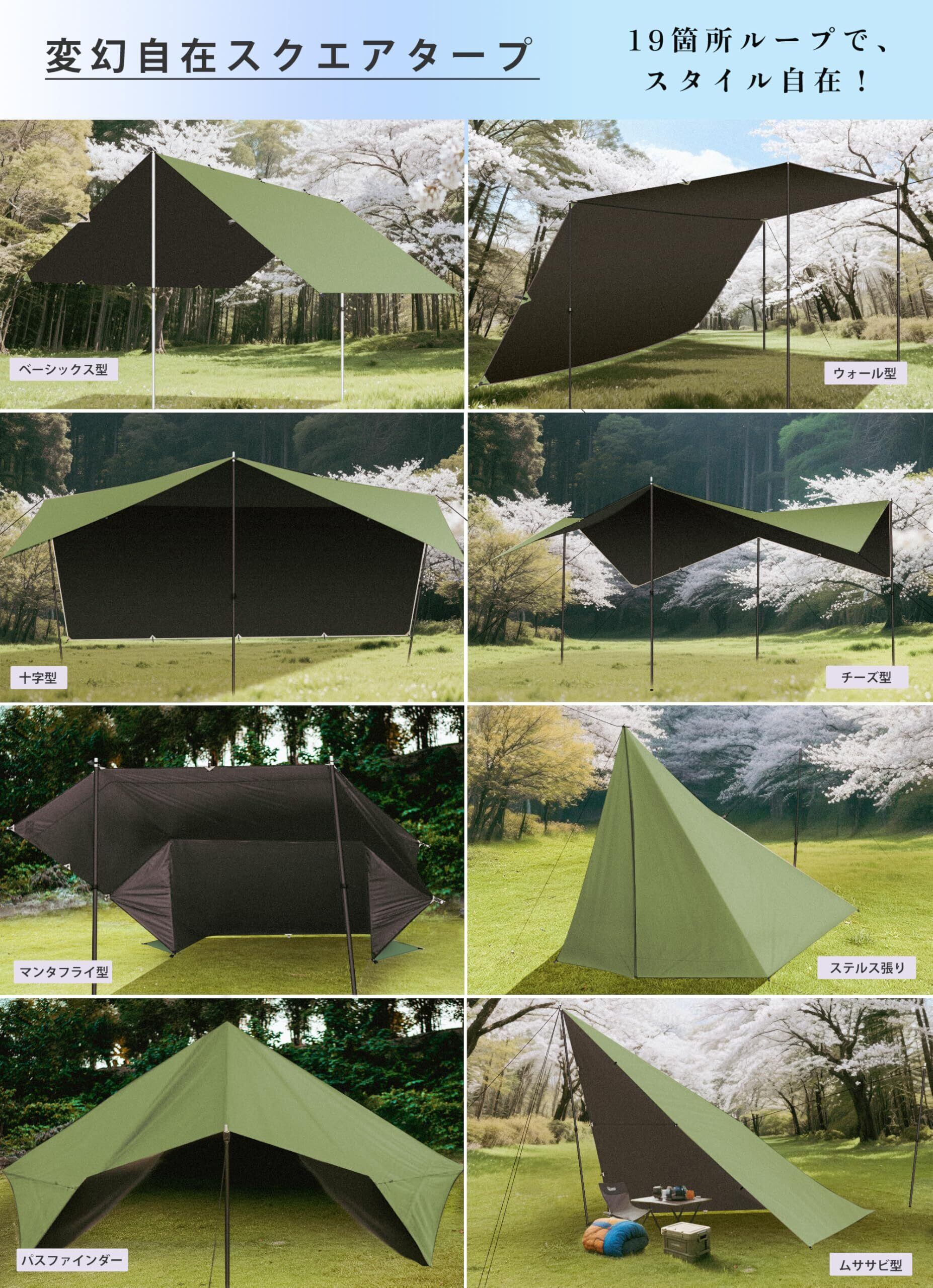 Origem タープ 正方形 スクエア 焚き火可 ポリエステル 耐水圧18000+mm ブラックコーティング【19ループ&11ハトメ・特殊防水テープ付き】遮光/遮熱/難燃 撥水加工 軽量 コンパクト キャンプ アウトドア 附属品付き (アーミーグリーン, 4.4mx4.4m)