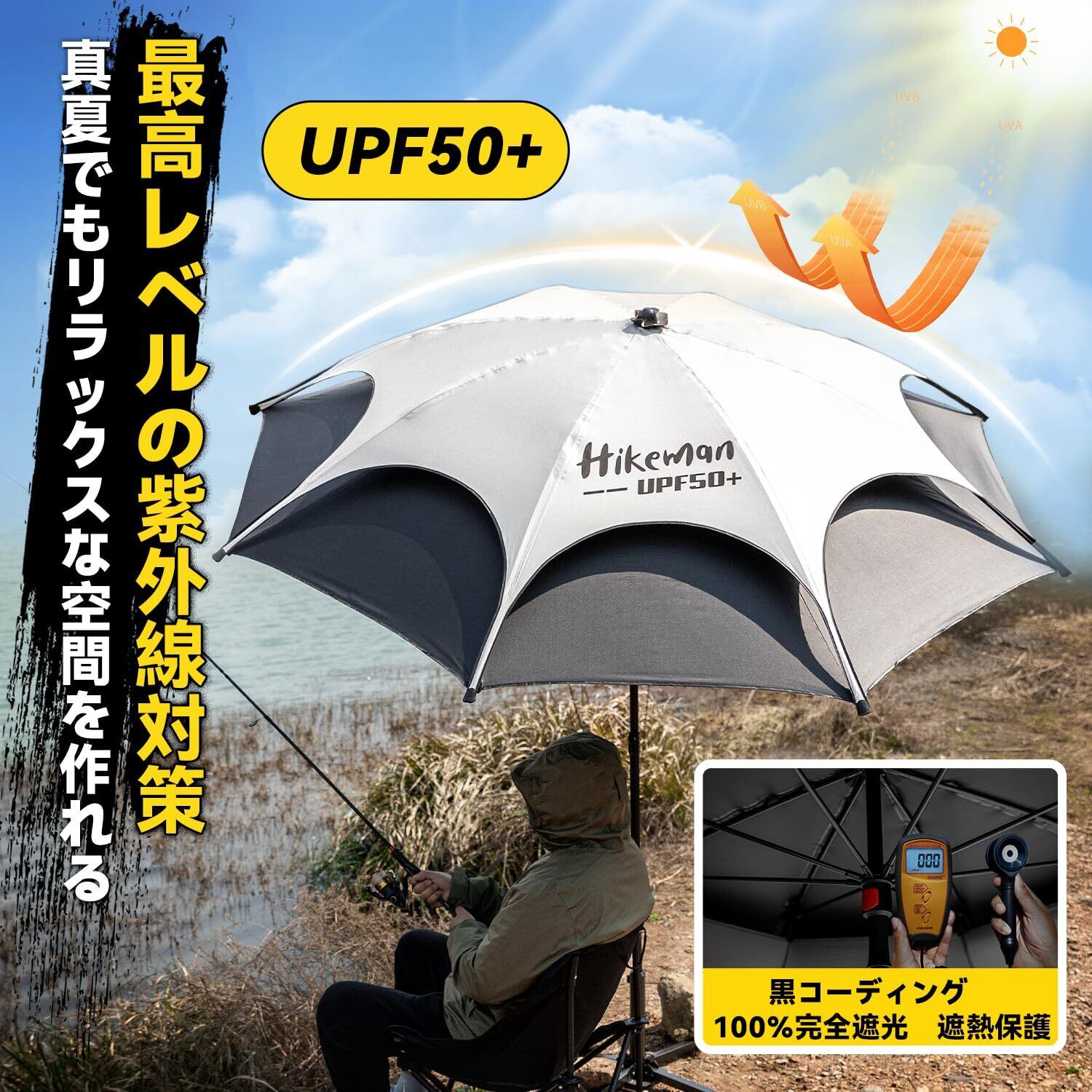大型範囲でUVカット:直径220CMもある大型パラソルで、そして裏面には遮光率100%のブラックコーティングが施されており、使用時は超広い日陰範囲を提供してくれます。UPF50+のUVカットで猛暑でも涼しくて楽しいお釣りができます。