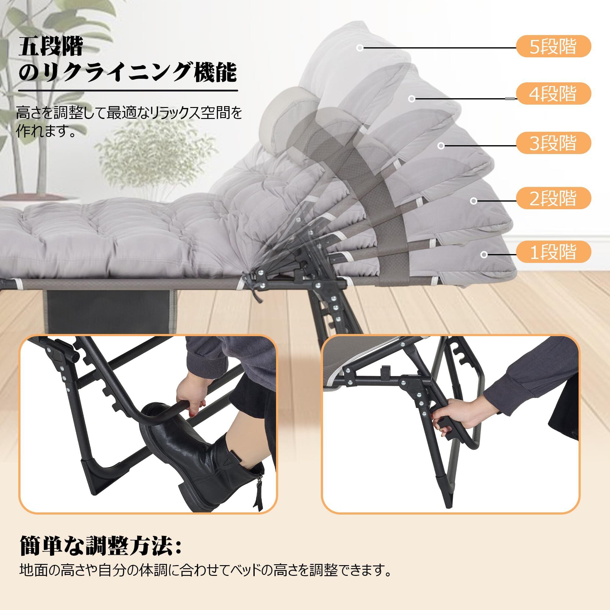 【多段階调整】折りたたみベッドは五段階のリクライニング機能を搭載しているため、好みに合わせて寝心地を調整できます。高さの調整により、寝る姿勢を最適化し、肩や腰への負担を軽減でき、長時間使用しても疲れにくいです。また、旅行先やキャンプ地で、地面の高さや自分の体調に合わせてベッドの高さを調整し、最適なリラックス状態を作り出すこともできます。