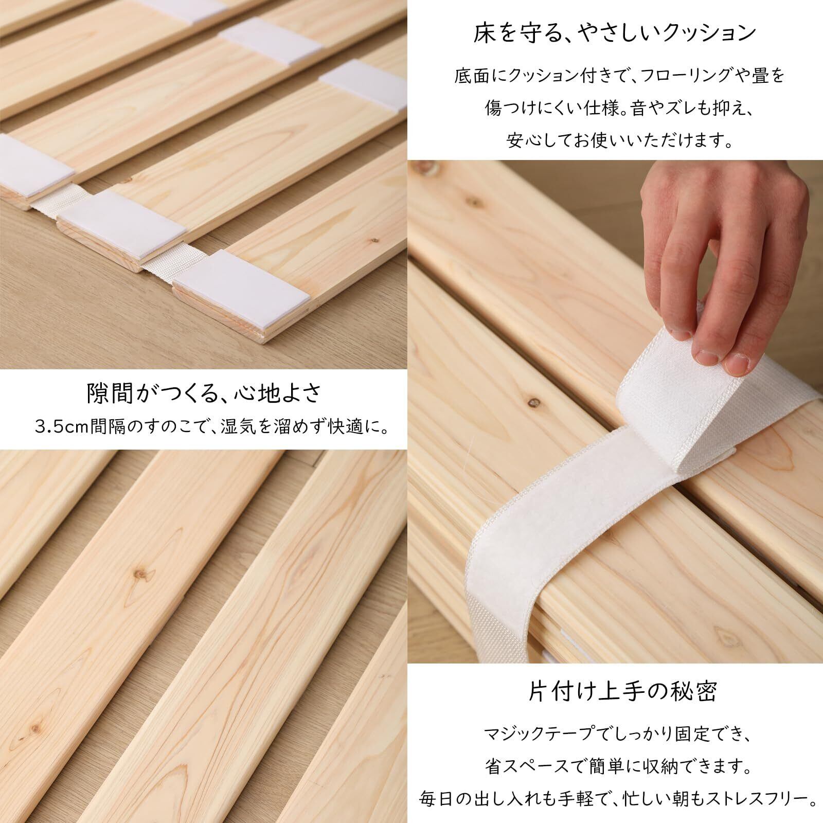 【素材】すのこベッド本体:国産ひのき/キズ防止クッション材:EVA。当すのこベッドには、日本国内で育った良質なひのき無垢材を使用しております。ひのき特有の清涼感のある香りが広がり、心と体を癒すリラックス空間を演出します。ひのきには、優れた調湿作用に加え、抗菌・防虫・消臭・防カビ効果などがあるとされており、通年を通して快適な睡眠環境を整える天然素材として高い評価を得ています。