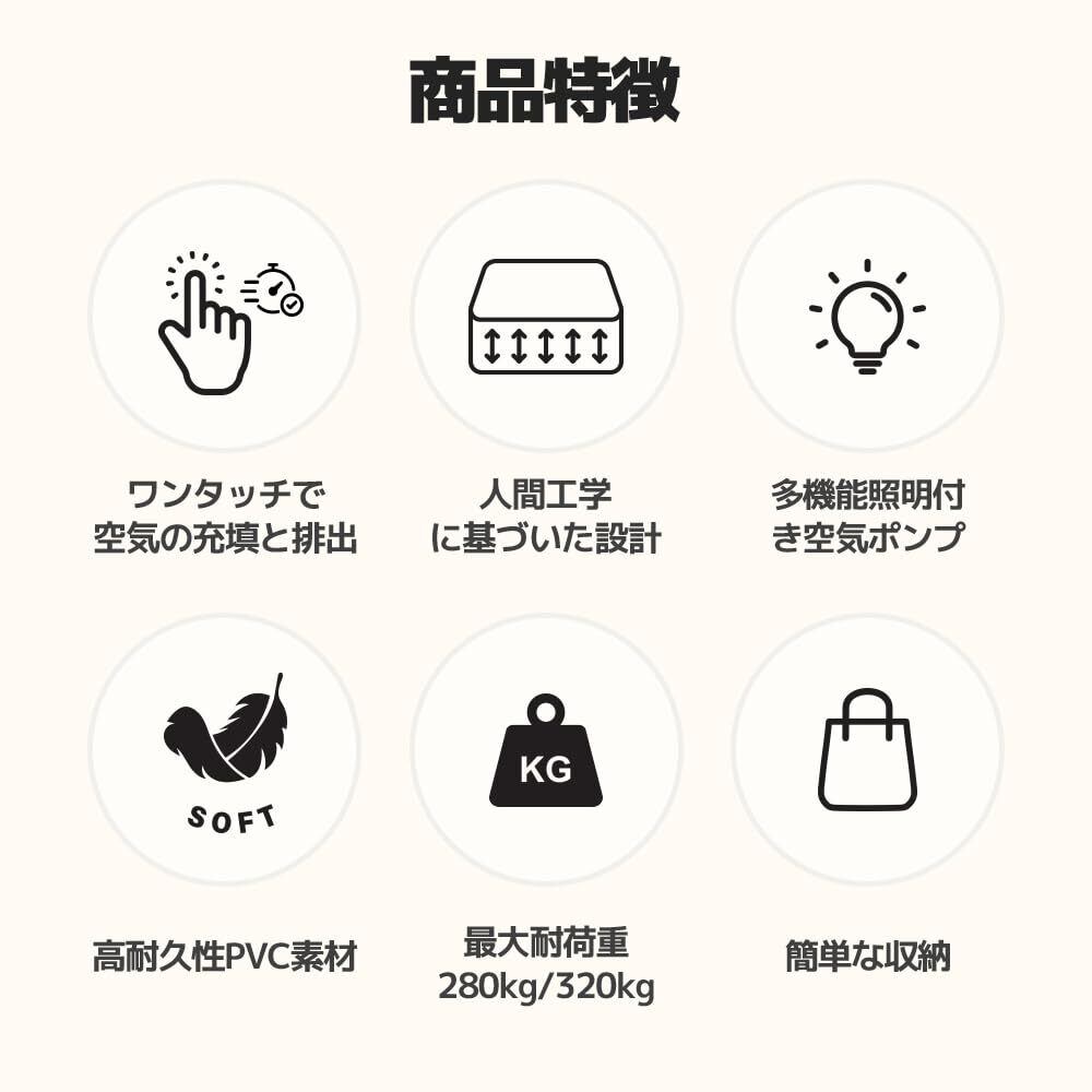 ダブルサイズ(Queen)空気注入式 エアーベッド製品サイズ(約) 202*152*40cm 重さ:7.4KG 耐荷重(約)300kg 素材 :ポリ塩化ビニル(PVC) 室内でもアウトドアでもマルチに使えます。【120秒で設置・撤収】 :LVYUAN(リョクエン)エアーベッドには、ダイヤルを回すだけで120秒で設置・撤収が可能な内蔵式電動ポンプが装備されています。外部電源要らない、本格的なアウトドアエアーマットです!