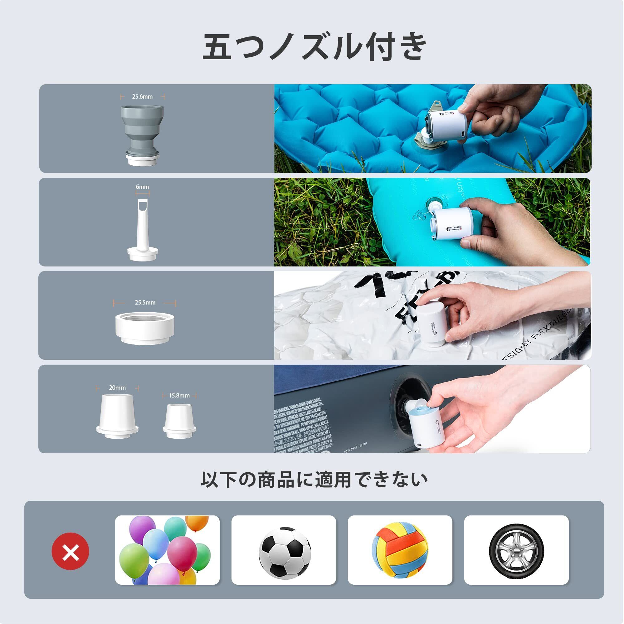 【多機能電動エアポンプ】5つのエアノズルを装備しており、さまざまな膨張ニーズに適しています。フロート、プール用おもちゃ、エアベッド、真空収納バッグ、屋外用エアクッション、車用エアクッション、スイミングリングなどの膨張式製品に広く使用されています。ご注意: 真空バッグ インターフェイスは、当社の 25.5 mm エア ノズルと互換性がある必要があります。正しく取り付けられていない場合、製品の吸引機能が正常に動作しません。