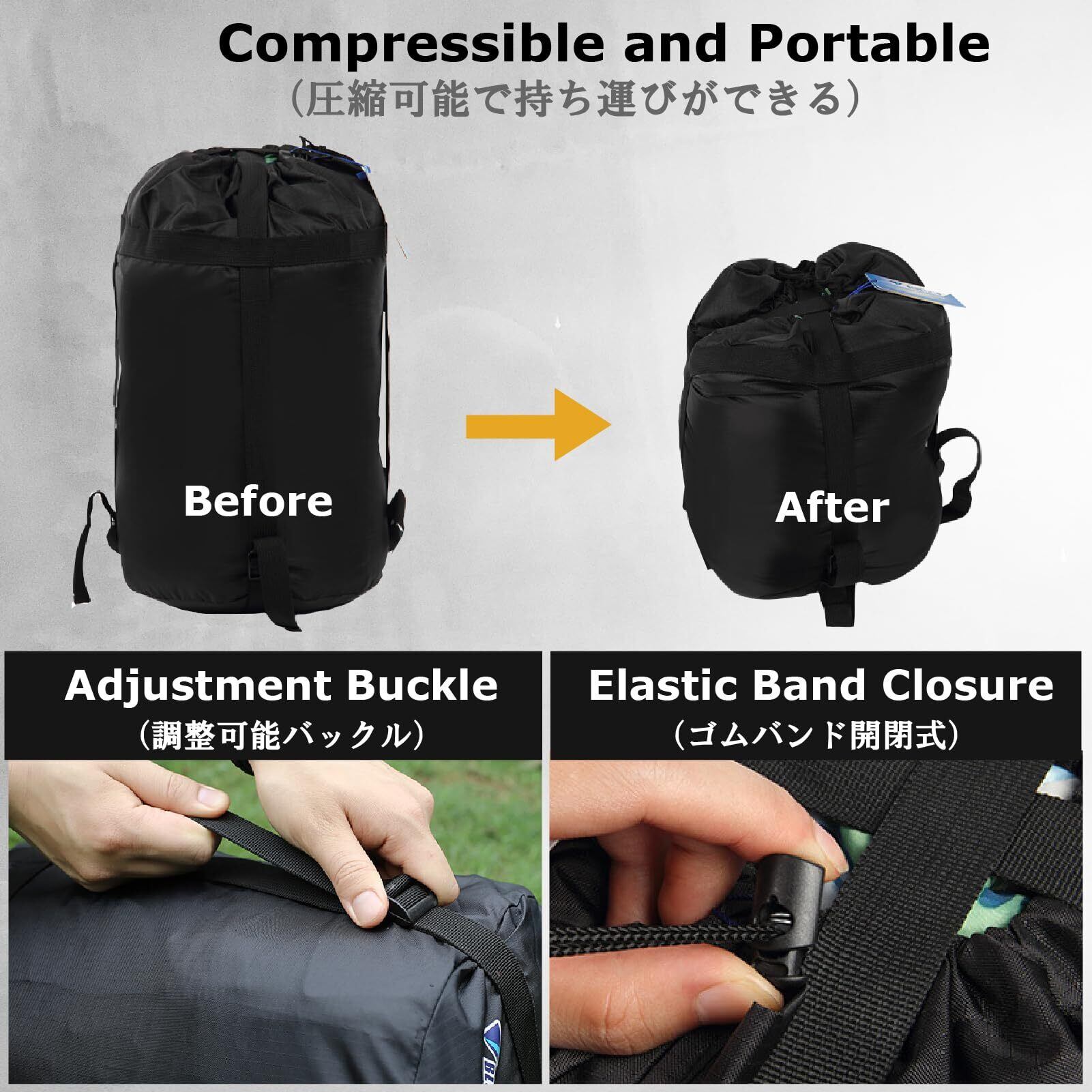 【効率的】アイテムをバッグに入れ、ベルトを締めて、非常に強く圧縮することが可能です。寝袋、衣類、毛布、カバー、ダウンシュラフ、ダウンジャケット、マット、枕などがパンパン圧縮できます