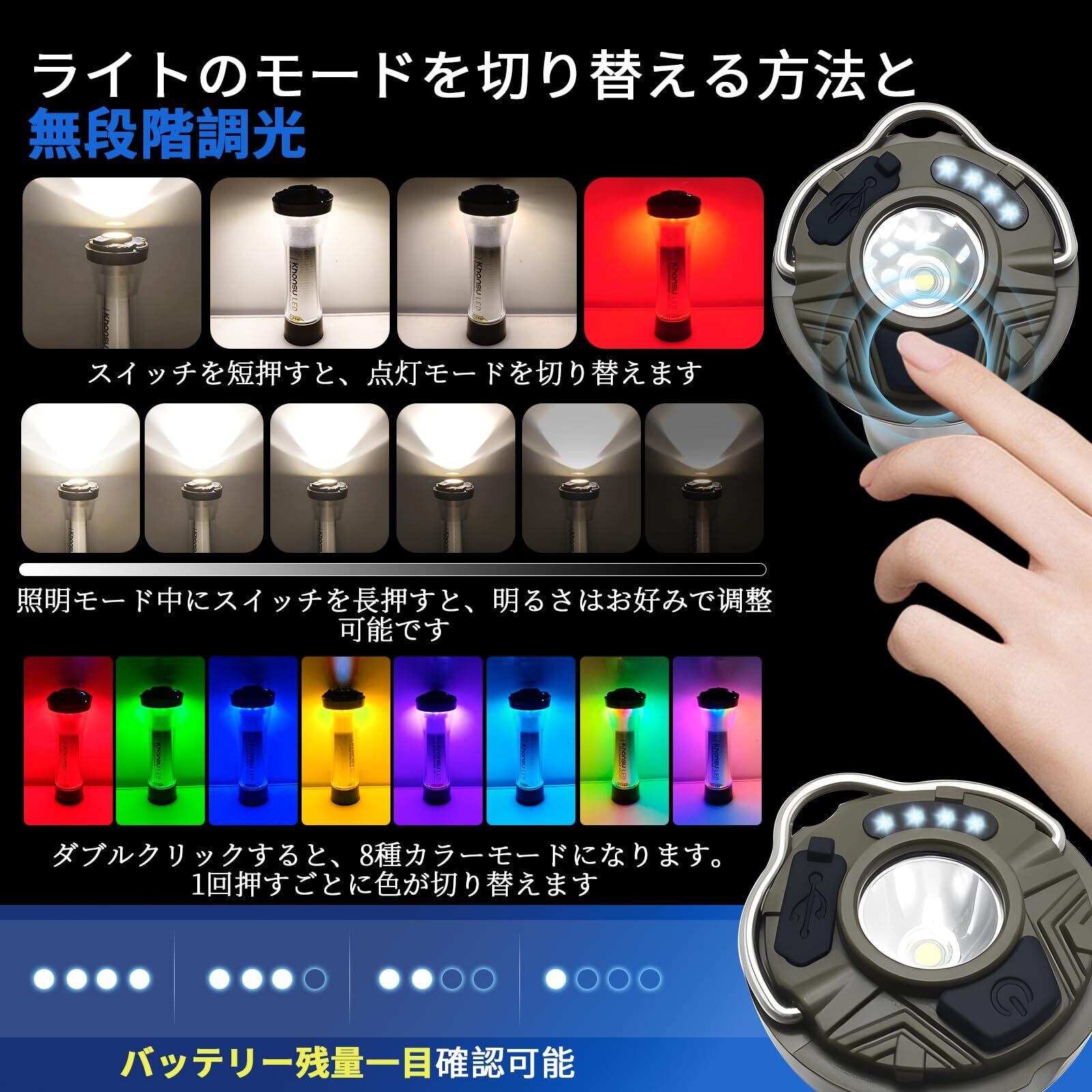 12種類ライトモード搭載:4種照明モード+8種類カラーモード(ニーズに合わせて照明モードを切り替えられ、キャンプの明かりからパーティーの雰囲光まで、幅広く対応可能。好みや雰囲気に応じて光の色を変更でき、空間の雰囲気を自由に演出することができます。
