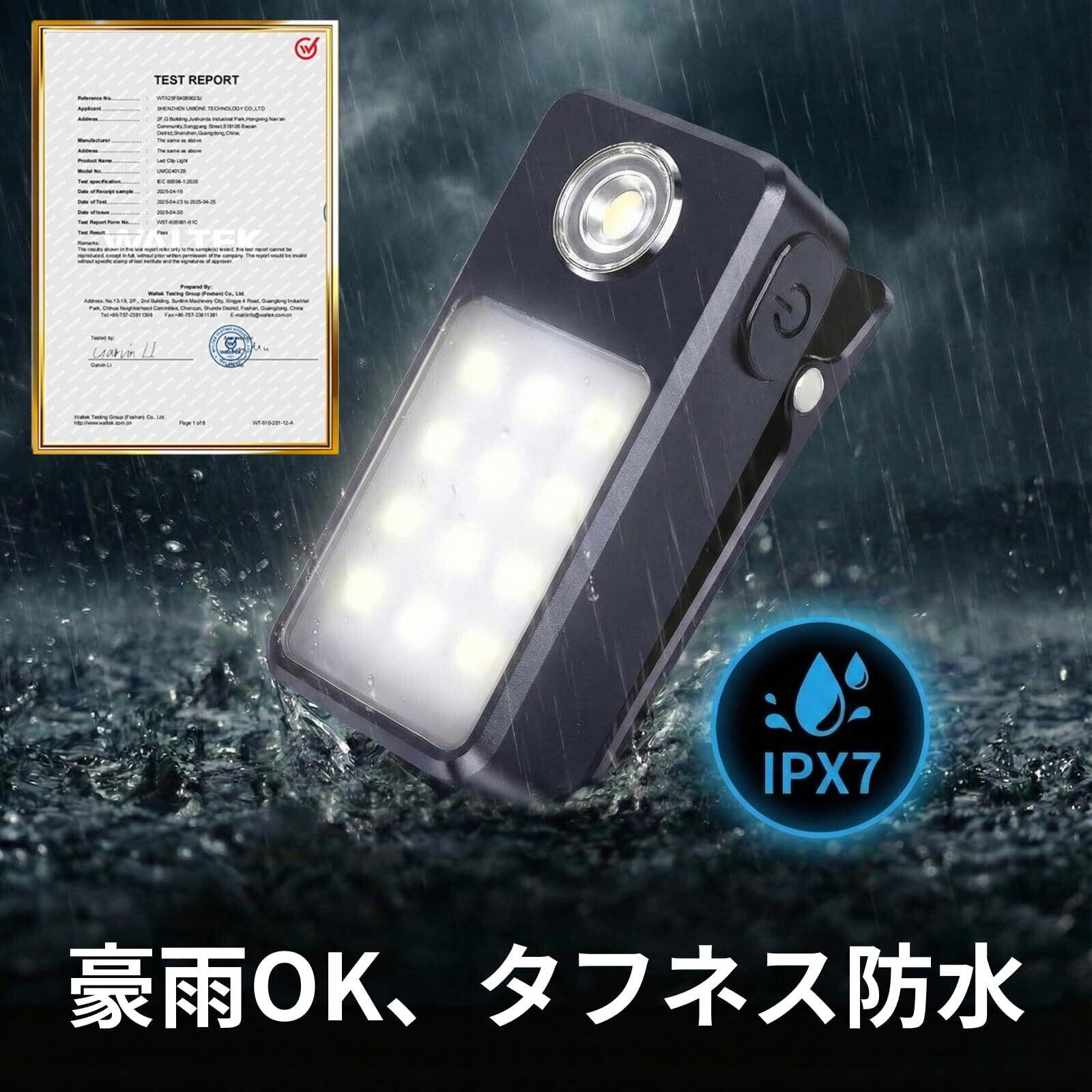 【スペック・IPX7防水】 ●防水性能:IPX7(豪雨でも安心のタフネス仕様) ●連続使用:通常ライト2〜9時間/最大50時間(赤色点滅時)●充電:USB-C充電(約1.75時間で満充電) ●残量表示:3色LEDで直感的に把握 ●サイズ:5.5×2.6×2.3cm コンパクト設計