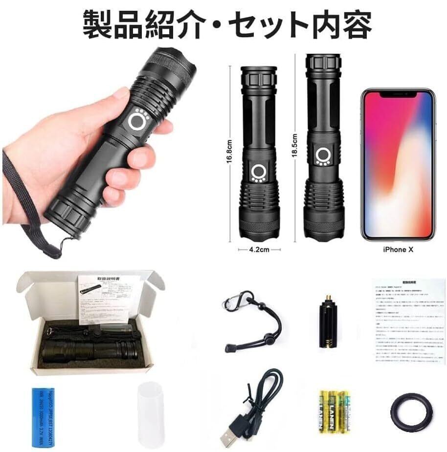 5、製品構成とアフターサービス:懐中電灯= 1、26650リチウム電池= 1、USB充電ケーブル=1。AAA電池=3,AAAバッテリーブラケット= 1、18650リチウムバッテリーチューブスリーブ= 1、収納ボックス= 1、日本語説明書付き。 HappyGo製品は全て231のアフターポリシーの対象です。2回使用された商品に満足できない場合は、理由なく返品することができます(品質に問題がない場合、購入者は返品送料を負担する必要があります)。30日以内の品質問題、無料返品が可能です。1年以内の品質問題は無料修理が可能です。