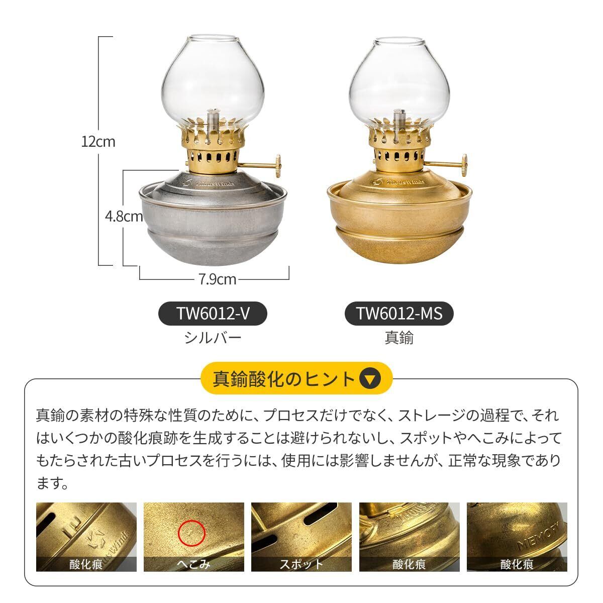 【仕様】ブランド:Thous Winds;商品名:ライトシャドーオイルランタン;重量:約250-270g;本体サイズ:7.9×12cm;材質:ステンレス、真鍮、耐熱ガラス;燃料タンク容量:80ml;燃焼時間:20h(燃料タンク満タン) 替え芯付き パラフィンオイルをお勧め 燃料は含まれていないので、別途購入する必要がある