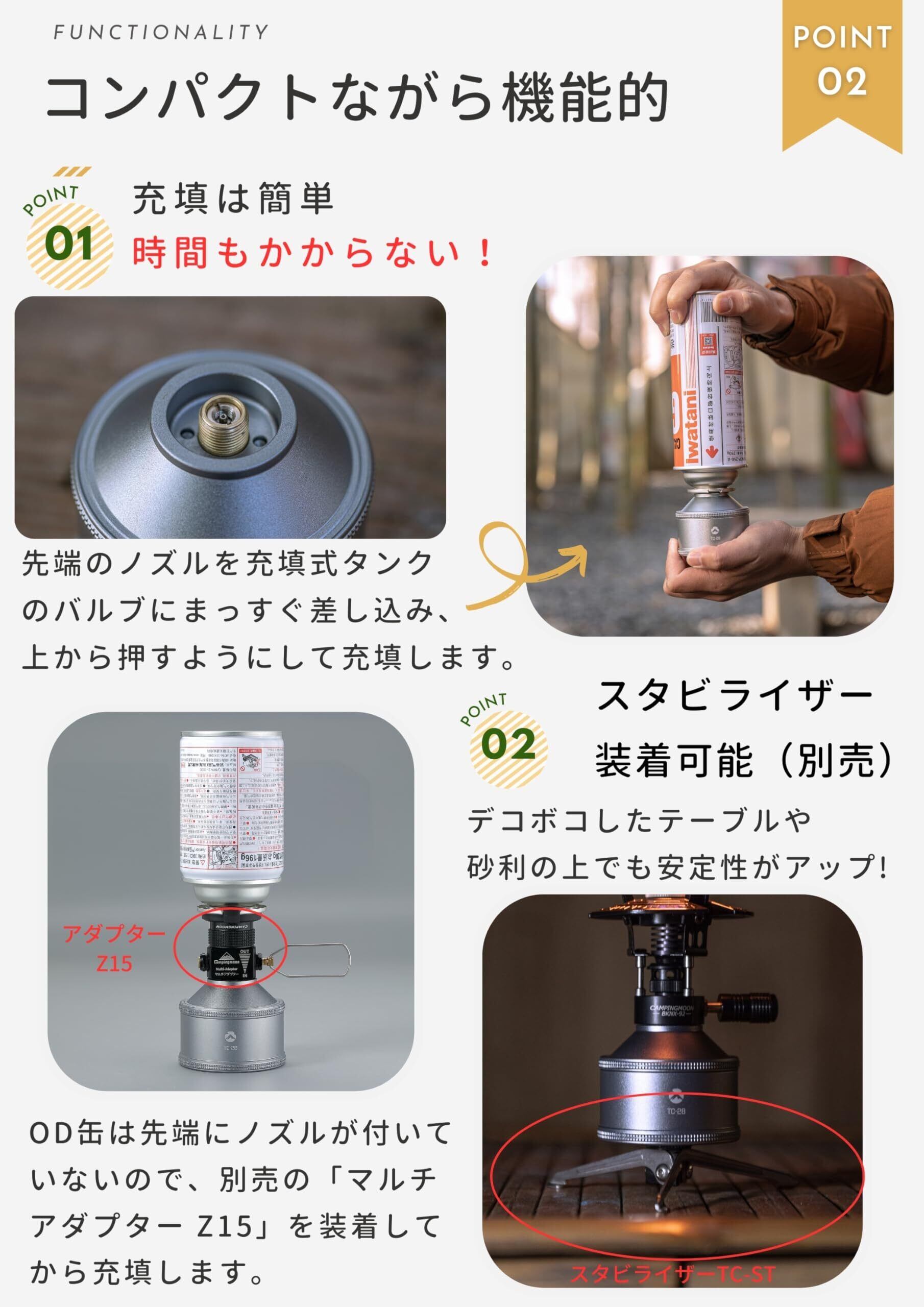 特徴:さまざまな燃料缶から充てん可能。 ライターガスをはじめ、CB缶、OD缶(※)からもOK!