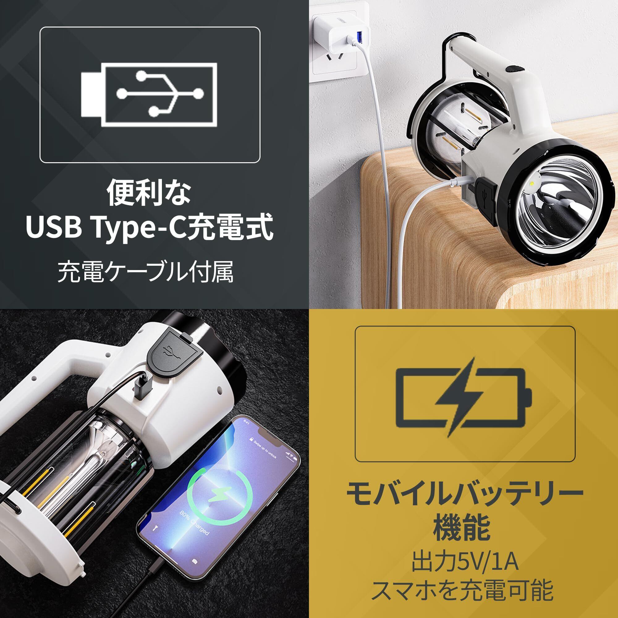 【大容量バッテリーと充電機能】VivToolsランタンは長時間のアウトドア活動に対応する大容量リチウム電池を搭載し、240時間の連続点灯が可能です。USB Type-Cでの充電が簡単にでき、スマホの充電も可能なモバイルバッテリー機能も備えています。