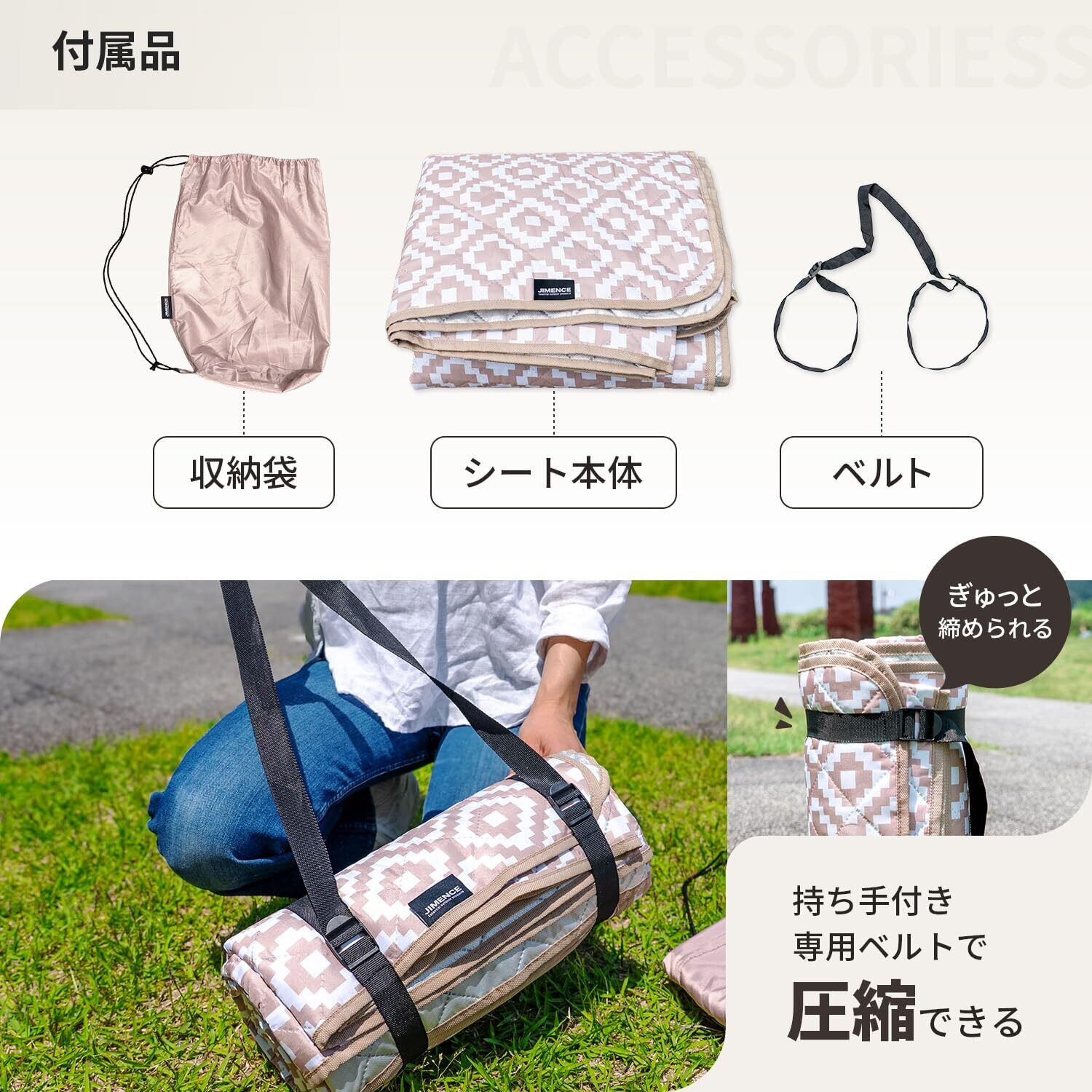 【3層構造】1)地面と接する裏面にアルミフィルムを使用しているため「防水性・断熱性・耐久性」に優れ、地面からの湿気や冷気をシャットアウトします。また、海水浴や川遊びで使う時に砂や草がくっつかずサラっと弾き返します。/2)真ん中に中綿が詰まっているため軽度のクッション性があります。/3)表面はポリエステルのサラサラとした素材ですので砂や草がくっつきにくいです。