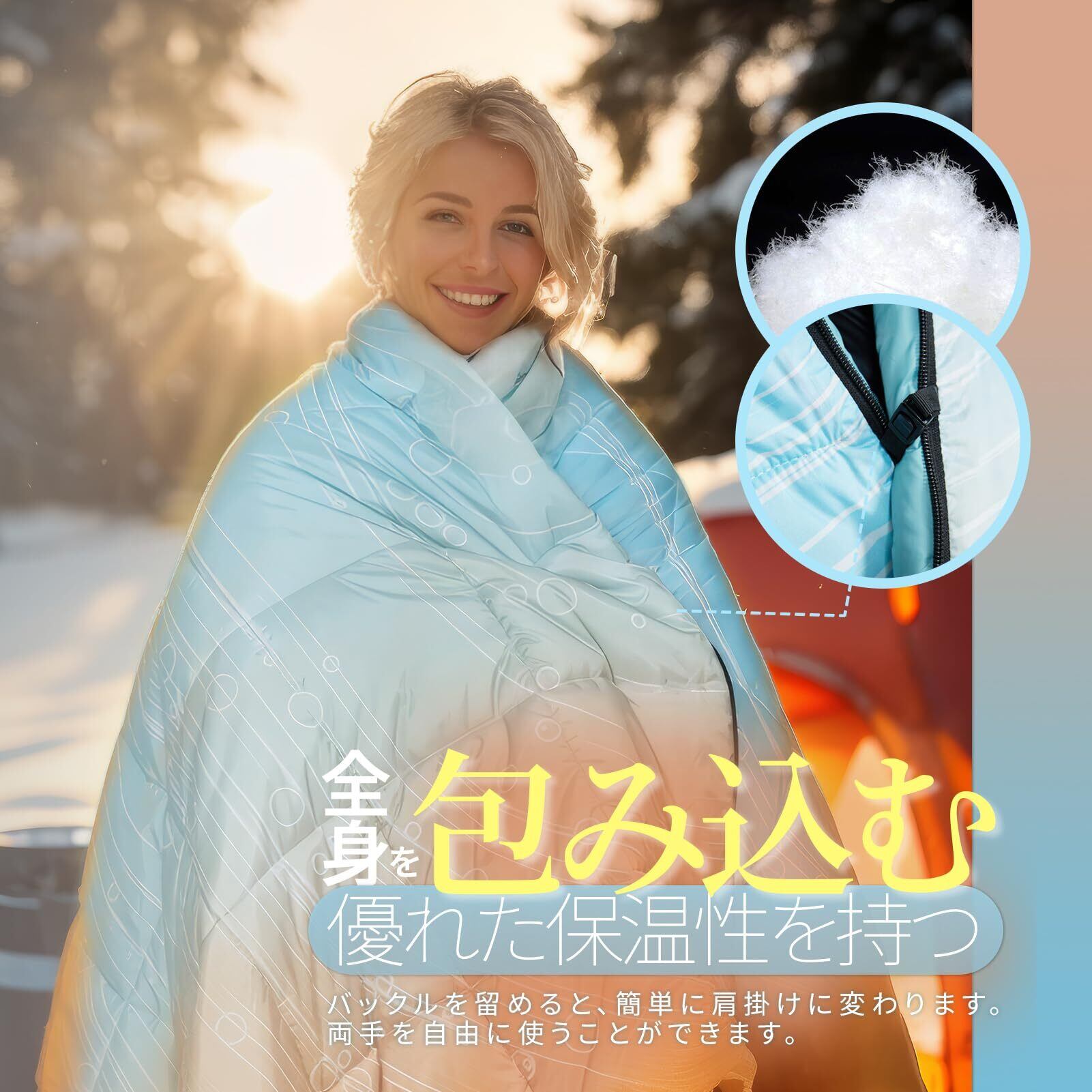 【多機能ブランケット】①肩掛けとして使えます。簡単に肩掛けに変わります。便利なバックルで肩に掛け、これにより両手を自由に使うことができます。料理をしたり、テントを設営したりする際にも動きが制限されません。②信封型寝袋として使えます。ジッパーを閉めれば、200x70cmの信封型寝袋に変わります。2枚のブランケットを連結し、200x140cmのダブル寝袋を作ることができます。シーンに応じて多機能に使えて、キャンプをより快適に楽しむことができます。