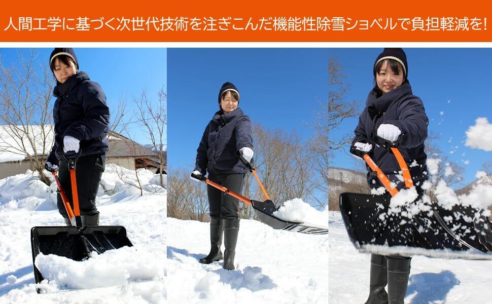 ポール部は丈夫な炭素鋼、皿部は樹脂(PP)で先端にワイドアルミブレード刃を採用。組立式で化粧箱内に分解された状態の梱包でお届けいたします。取っ手部分は弾力性がありその跳ね返る力を利用して重い雪上げ作業をサポートします。