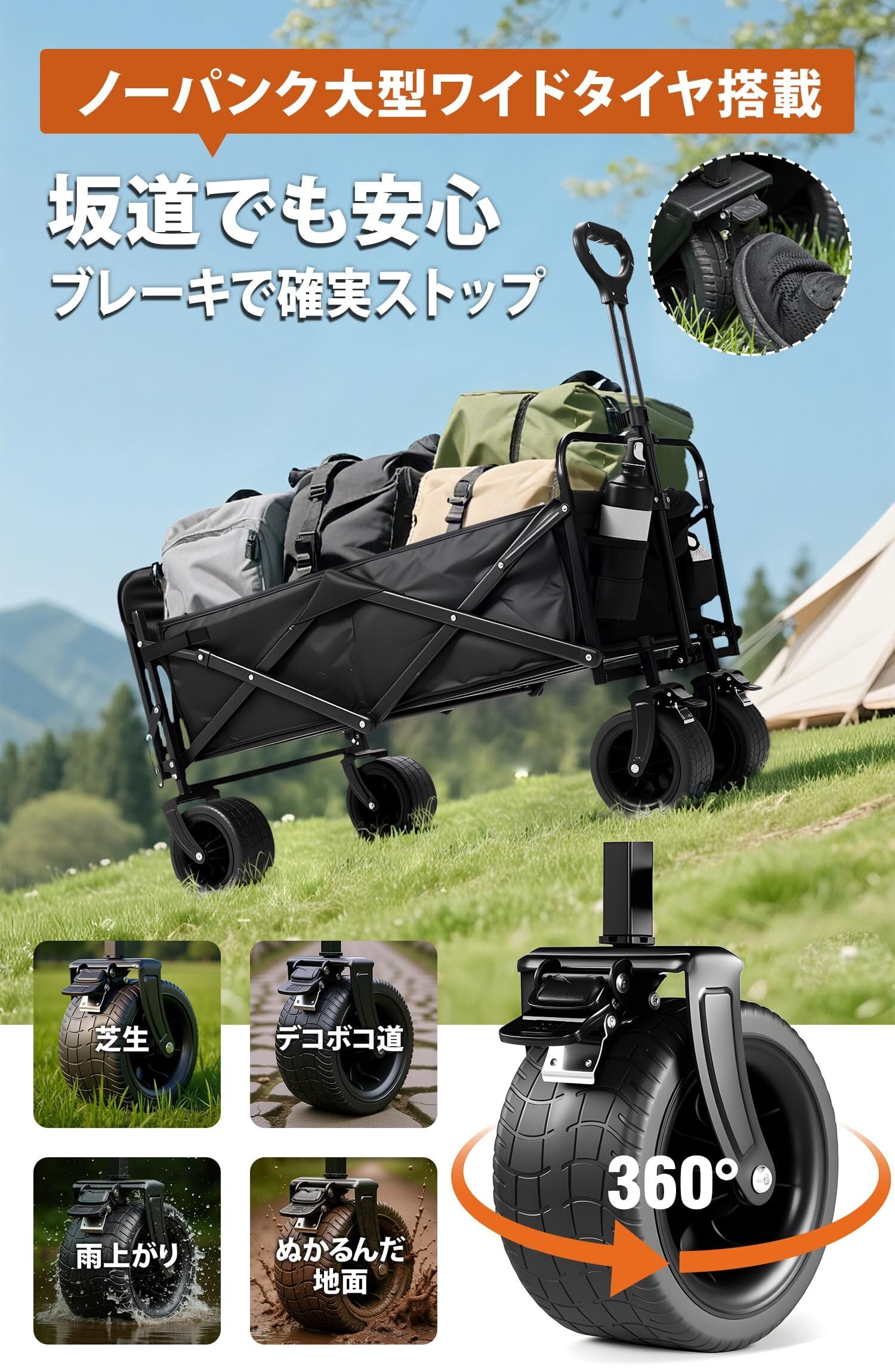 【マルチ機能搭載の大型タイヤ&ブレーキ】 ダブルフロントブレーキと特大の360°回転可能なホイール(幅:8.2cm、直径:17cm)を搭載。PVC素材 余分な力を必要とせず、どんな場所でも力を発揮します。平坦な場所はもちろん、砂浜、砂利道、草地などデコボコした道でもスムーズに移動可能。比類なき制動機能で、坂道でも安心して使用できます。