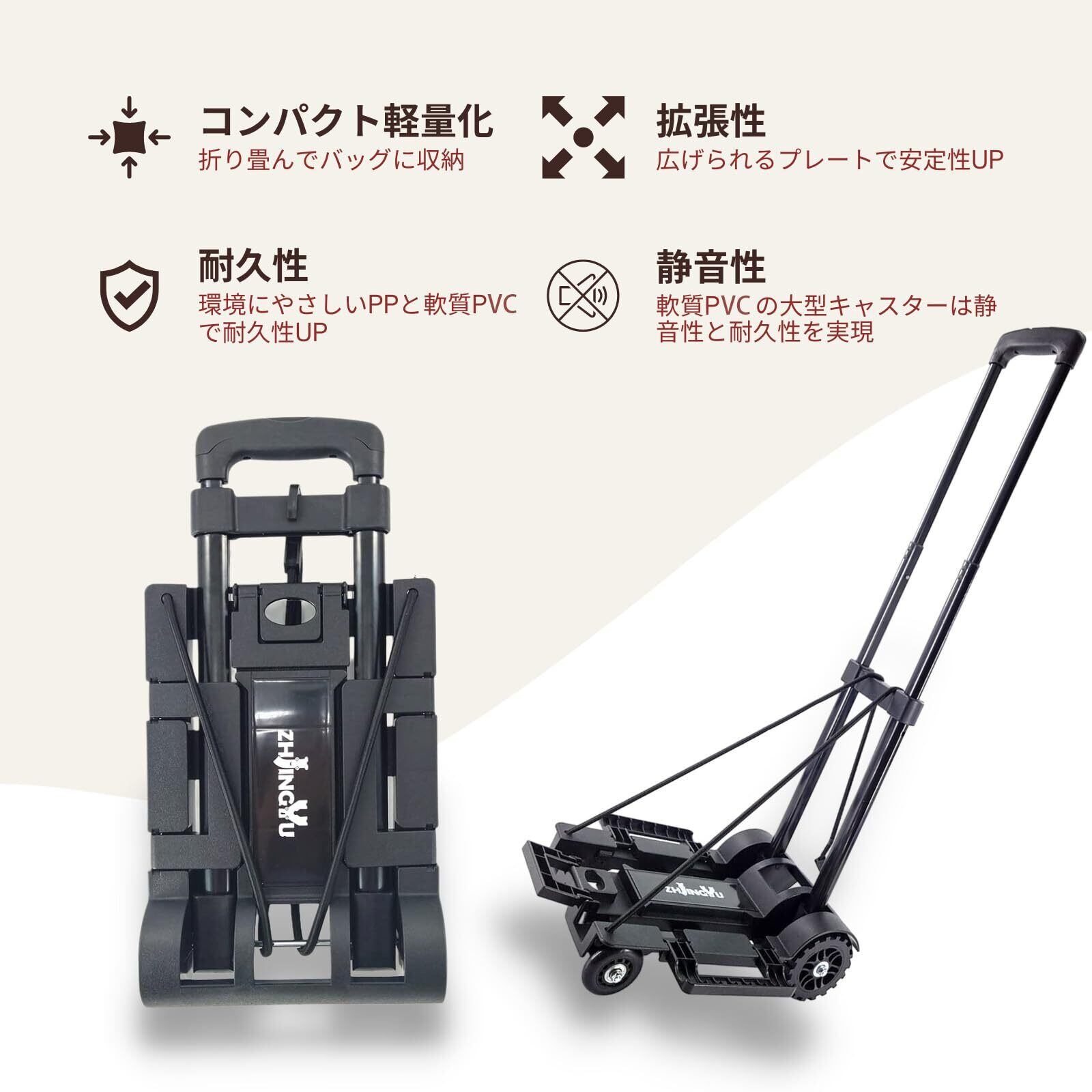 キャリーカート 台車 折りたたみ式 軽量 プレート拡張可能 静音 超コンパクト 固定ゴムロープ付 荷物運搬 引越し アウトドア 4輪 ブラック
