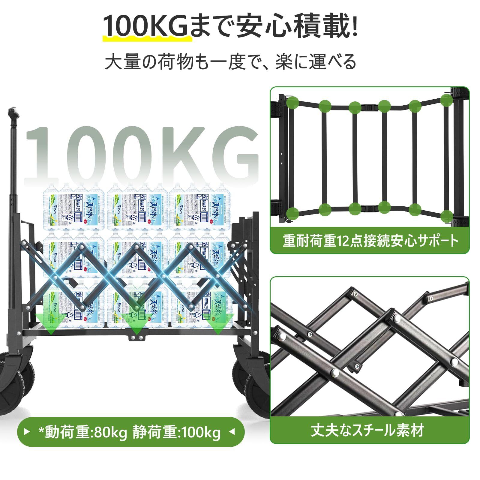 【後部展開で容量アップ&100KG高耐荷重設計】 キャリーワゴンは頑丈なスチールフレームを採用し、静荷重100kg・動荷重80kgに対応するプロ仕様設計。12点連結フレーム構造により荷物を均等に分散し、安定性は抜群。140Lの大容量(後部開口含む)で、キャンプ用品やまとめ買いした荷物も一度にラクラク運べます。荷台サイズはL50 × W38 × H25cm。長い荷物や大きなアイテムも無理なく積むことができ、移動や運搬がより快適かつ安心になります。一般的な後開け部は布で剥がれやすいのですが、当社のは鉄製ですので、より丈夫で長持ちします。