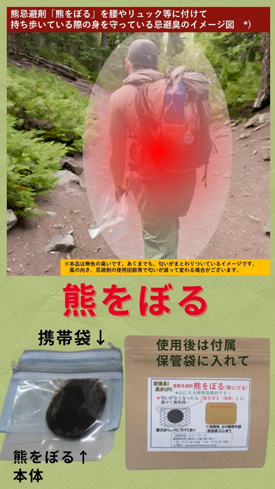 熊対策・第2の鈴として。携帯タイプの熊よけ忌避匂い袋「熊をぼる」携帯用1個。山菜取り・登山・キャンプ・農作業の安全対策に最適。取得のカプサイシン・木酢液配合の強烈な刺激臭で熊撃退!。携帯しやすいポーチタイプのクマよけ忌避剤なので取り扱いも簡単。