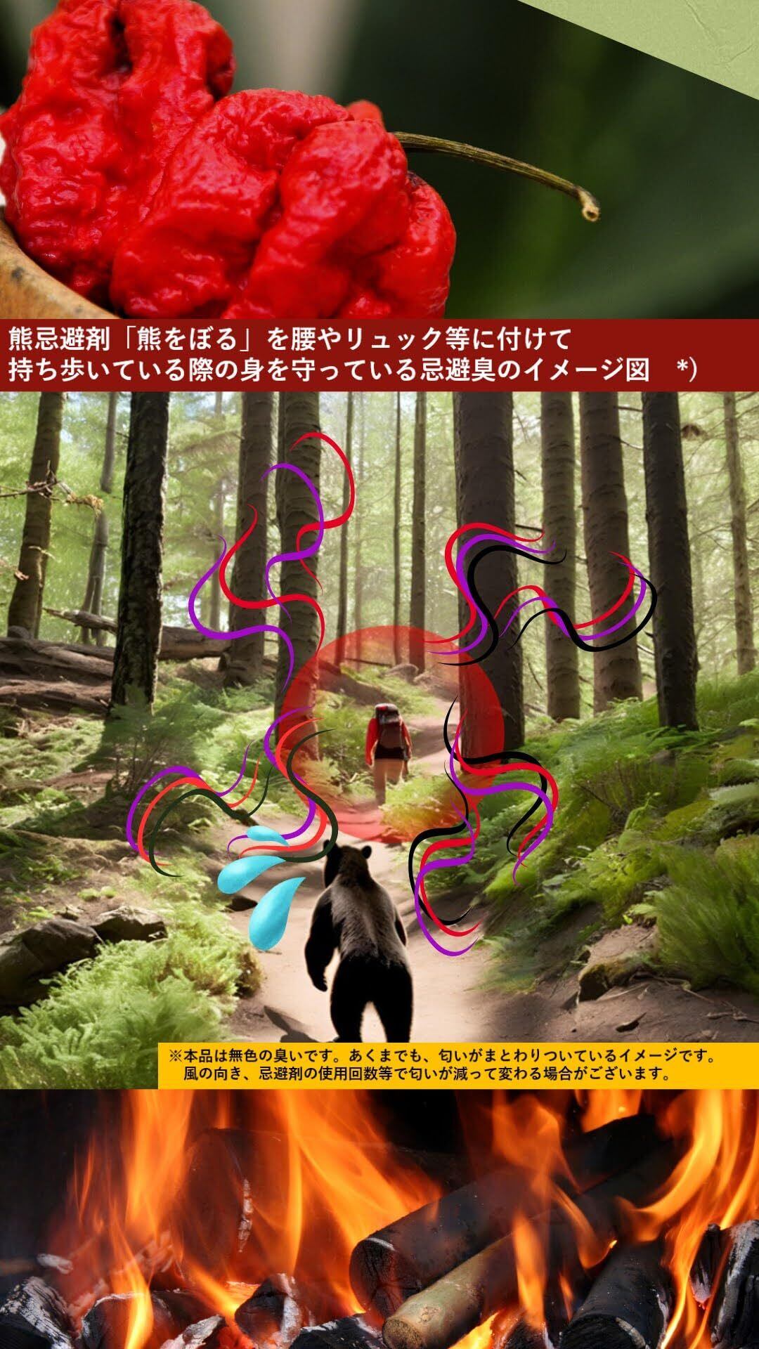 強力な刺激臭: カプサイシンや木酢液を配合しているため、強烈な刺激臭を発生させます。この臭いを嗅いだ熊は、体が燃えてしまうような感覚になると言われています。