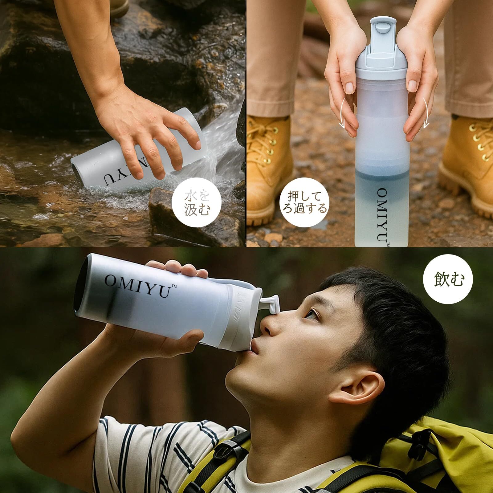 携帯浄水ボトル 500ml 直飲み プレス式 UF中空糸膜 活性炭 SGS試験 防災 交換用フィルター対応