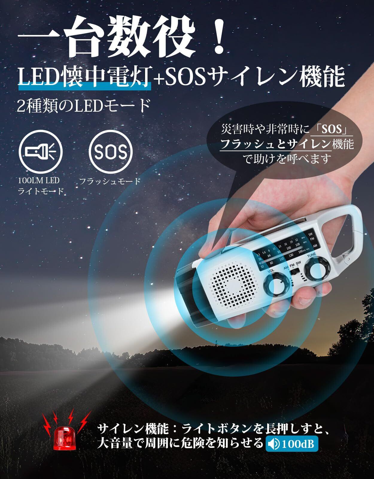 【多機能!懐中電灯として&フラッシュとサイレン】懐中電灯機能付きの多機能防災ラジオは、災害時に停電が起こったときや、夜間に避難所などへ移動するときに役立ちます。防災ラジオと兼用で使えるため、懐中電灯を別で持ち歩く必要がない分、防災グッズの量を減らせます。"ŏ" ボタンを軽く押すと、100LM懐中電灯→SOSフラッシュのモードに切り替えることができます。"ŏ" ボタンを長押しすると、SOSサイレン機能が作動。100dB大音量アラームとLEDライトの点滅で、自分の居場所や危険を知らせ、安全を確保します