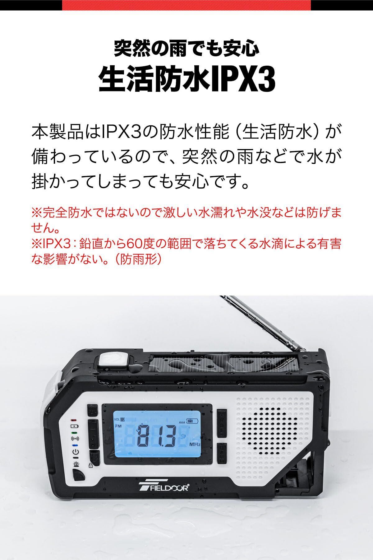 FIELDOOR 防災ラジオ 多機能 懐中電灯 USB充電 乾電池 スマホ充電 ソーラー 手回し モバイルバッテリー ソーラー充電 生活防水 AM/FM ラジオ LEDライト SOSアラーム 2000mAh イヤホン 防災 災害 ポータブル グッズ デジタル表示 カラビナ 栓抜き付き