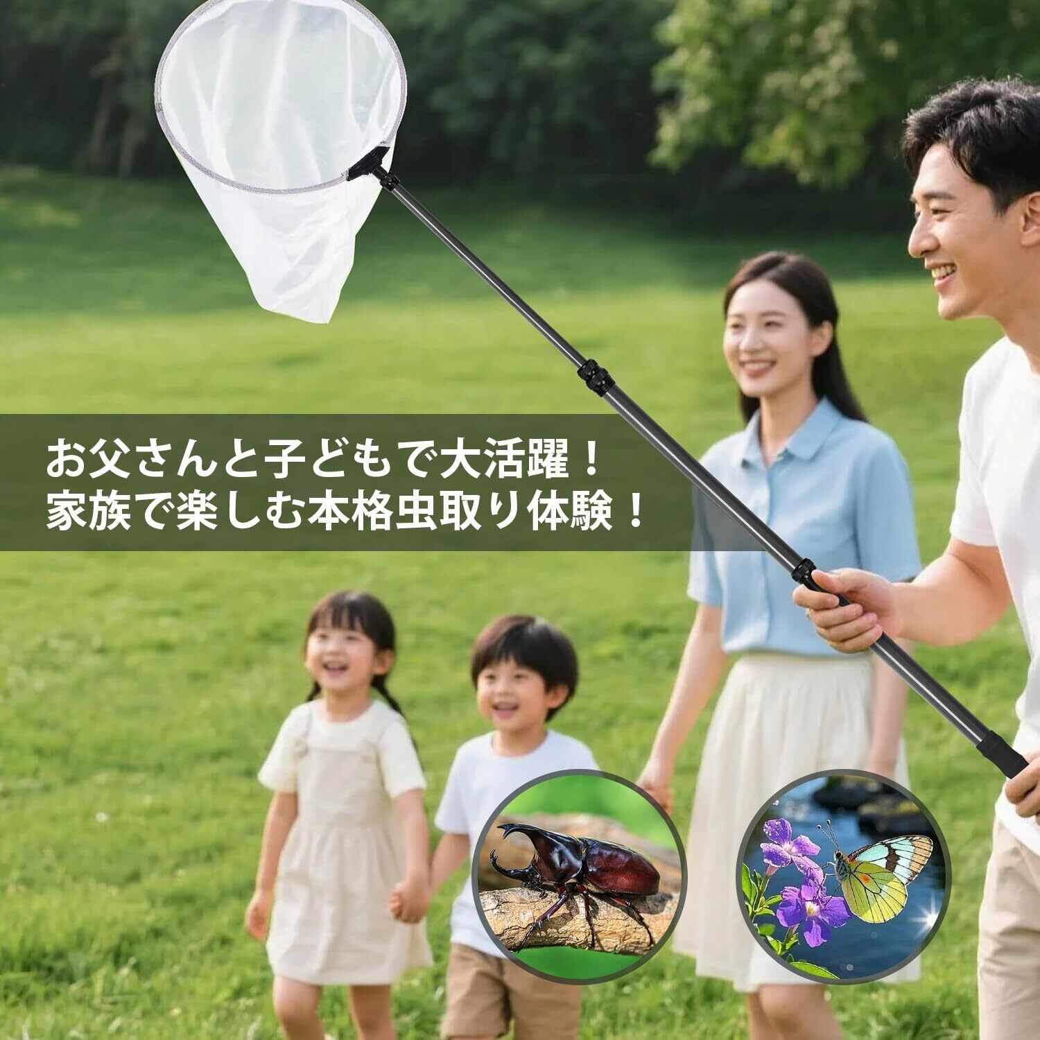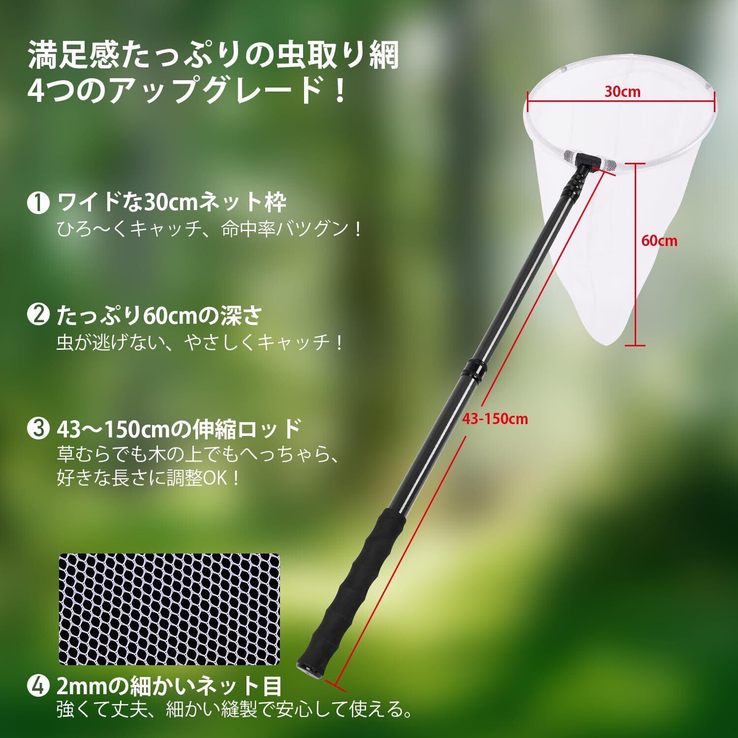 【直径30cmのワイドネット】プロ仕様虫取り網は直径30cmの大きめフレームで、広範囲の虫を効率よくキャッチ。通気性の良いメッシュ素材を使用し、メッシュの大きさは2mmで、虫をしっかりと捕まえることができます。
