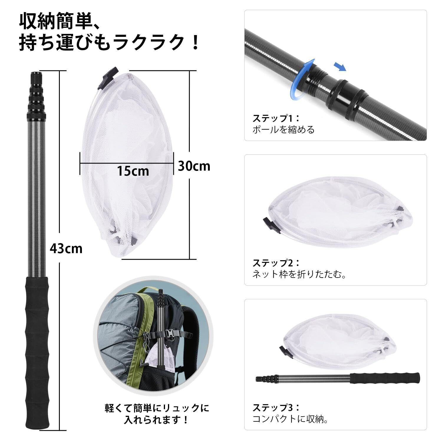 【簡単収納&コンパクト設計】むしとりあみは使わないときは縮めてコンパクトに収納可能。ポールとネットヘッドは取り外し可能で、ポールを縮めるとわずか42cmになります。折りたたんだ後は、バックパックやリュックに簡単に収納でき、キャンプ、釣り、登山などのアウトドア活動に最適です。