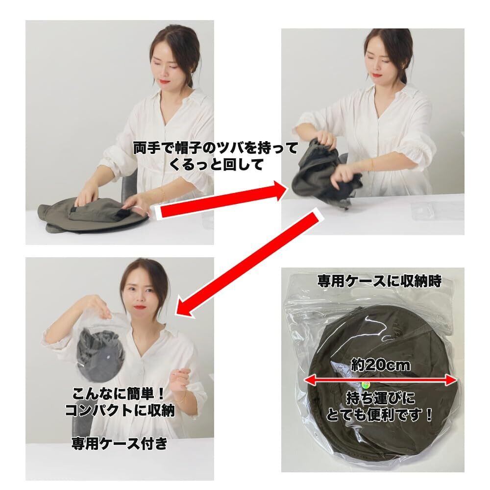 【楽々コンパクトに収納】 両手で帽子のツバの部分をくるっと回すと簡単に折り畳めて、付属の専用ケースに収納することができます。専用ケースに収納された帽子の直径は約20cm。コンパクトで持ち運びにも大変便利です。