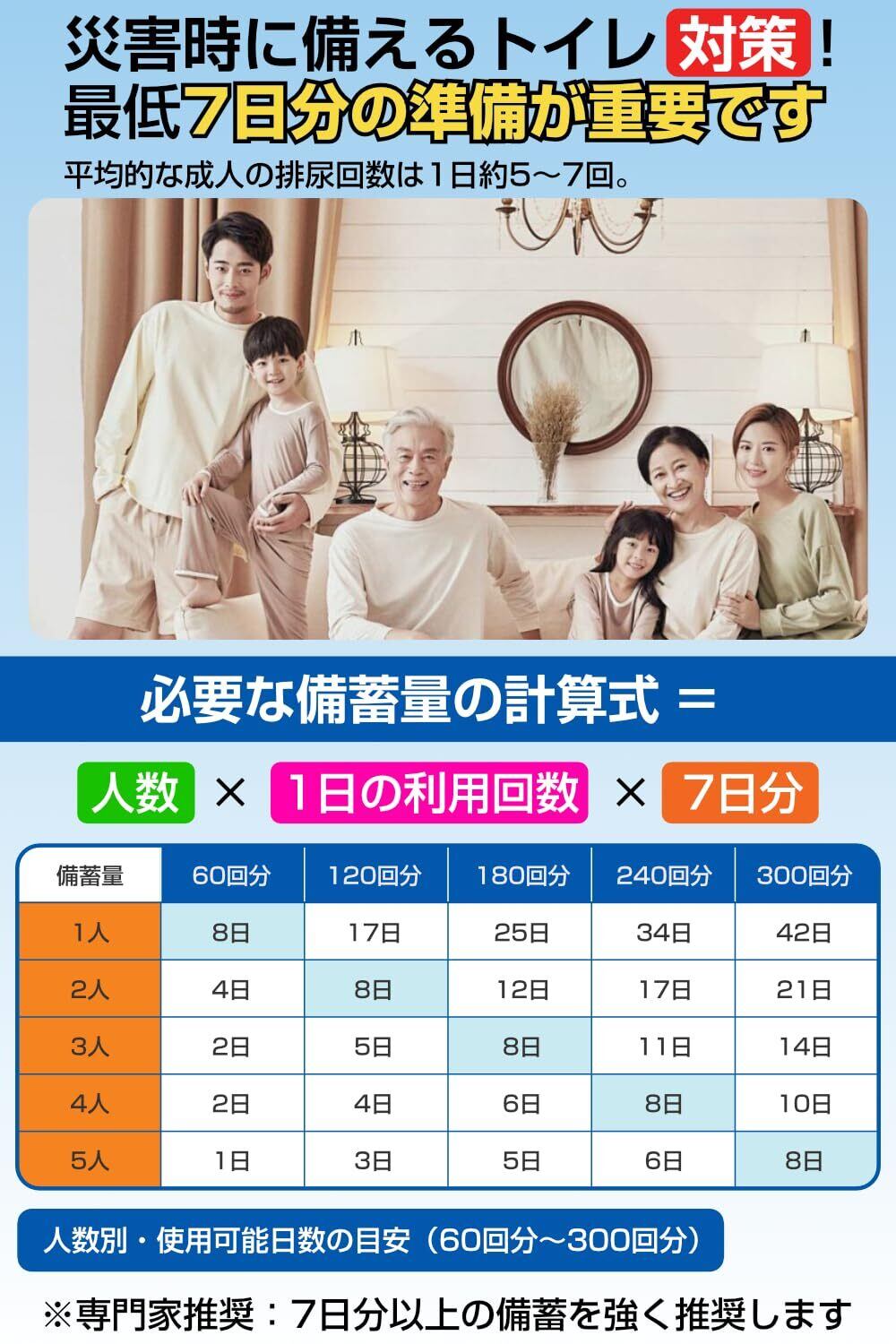 【15年保存可能な大容量60回分セット】酸化防止アルミシート内蔵包装により15年間の品質保持が可能。セット内容は凝固剤60回分・排便処理袋60枚・防臭密封袋5枚・手袋120組を同梱。大人3人分の2日間使用に最適な設計で、コンパクト収納袋(縦25cm×横18cm×厚さ5cm)で場所を選びません。