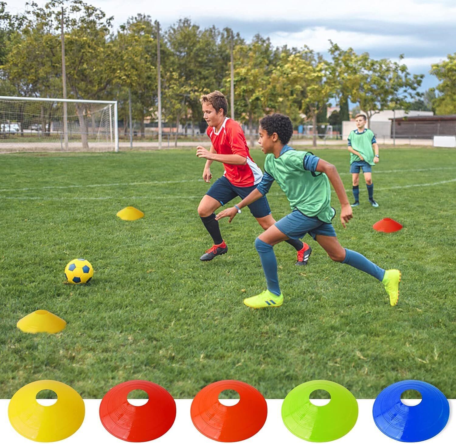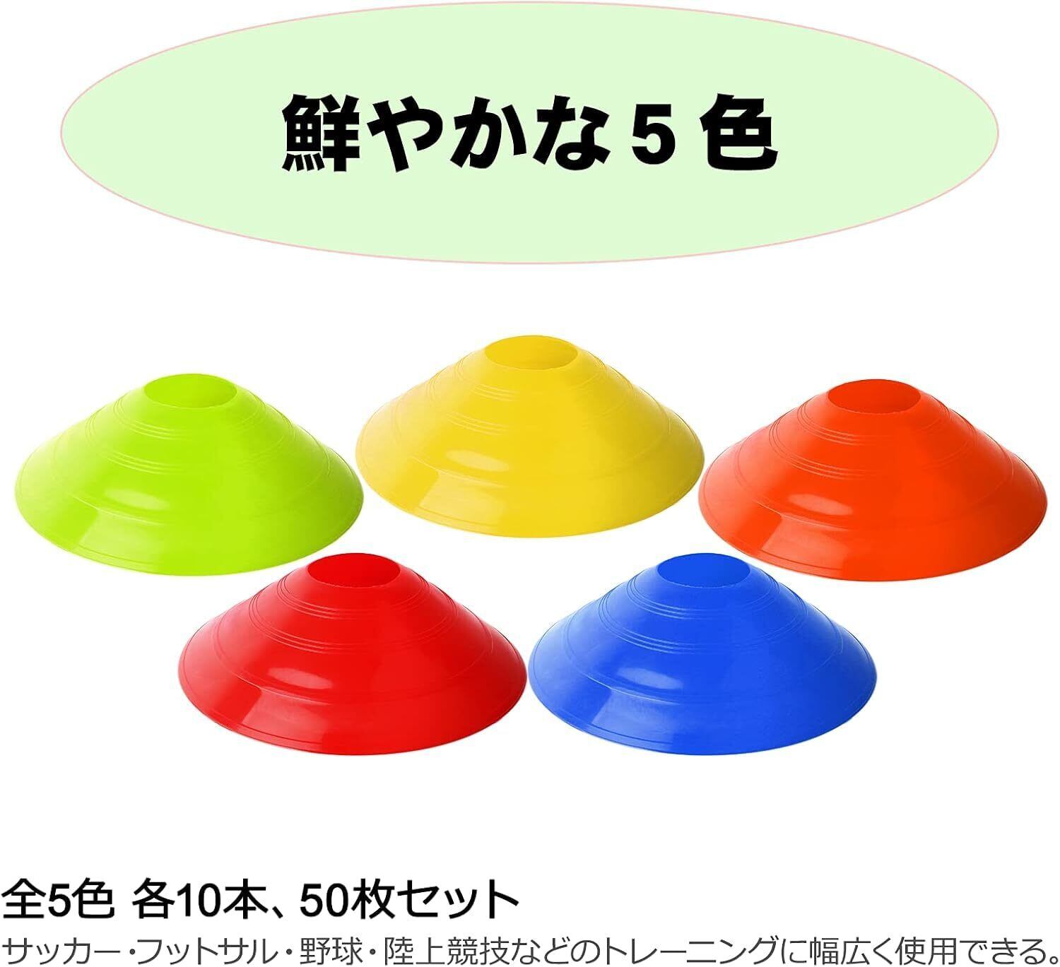 CYFIE マーカーコーン 50枚 カラーコーン 割れにくい サッカー/フットサル用品 トレーニング ディスクコーン ミニコーン 各10本 セット収納袋付き コンパクト レッド/ブルー/オレンジ/黄色/グリーン 全5色 50枚セット