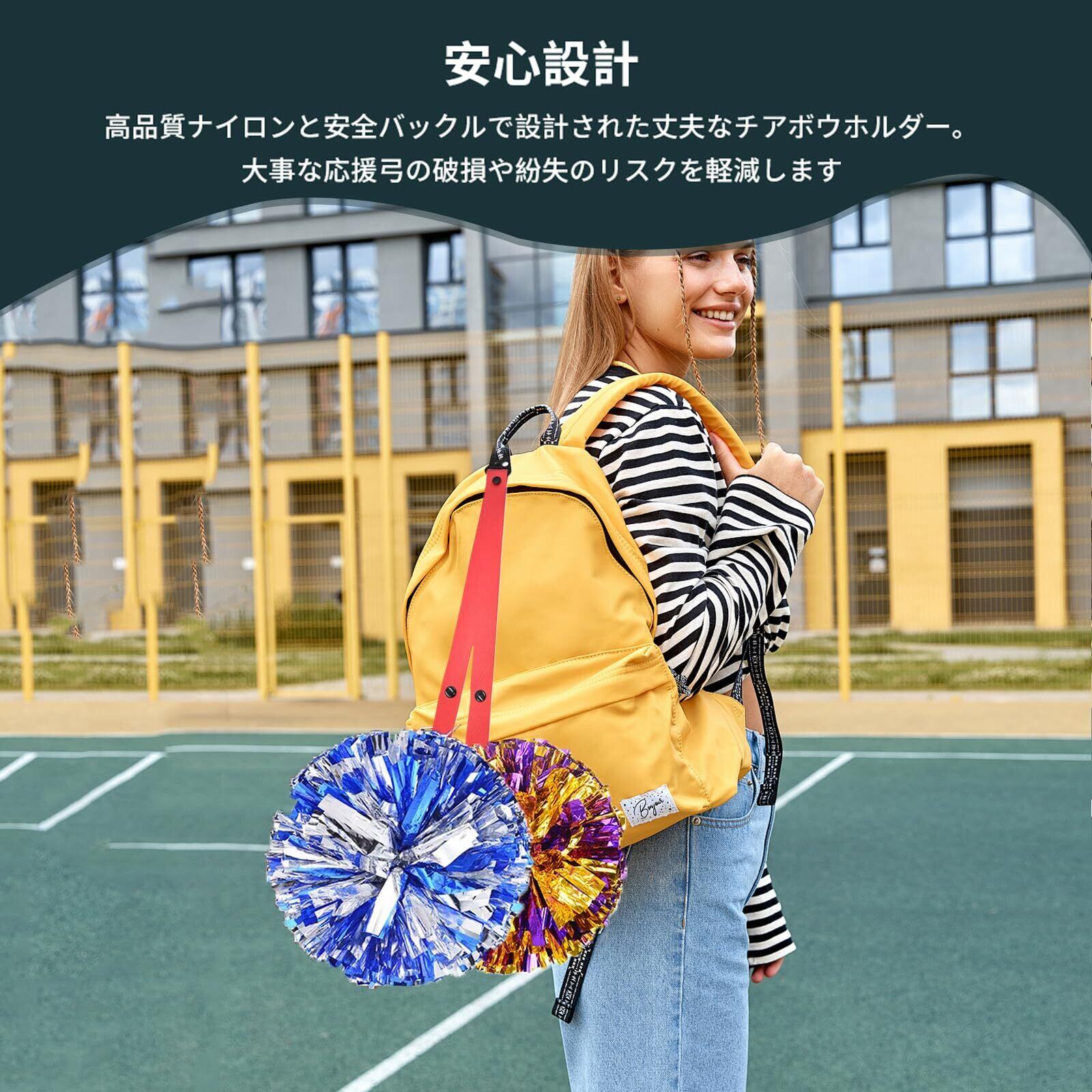 【安心設計】高品質ナイロンと安全バックルで設計された丈夫なチアボウホルダー。大事な応援弓の破損や紛失のリスクを軽減します。