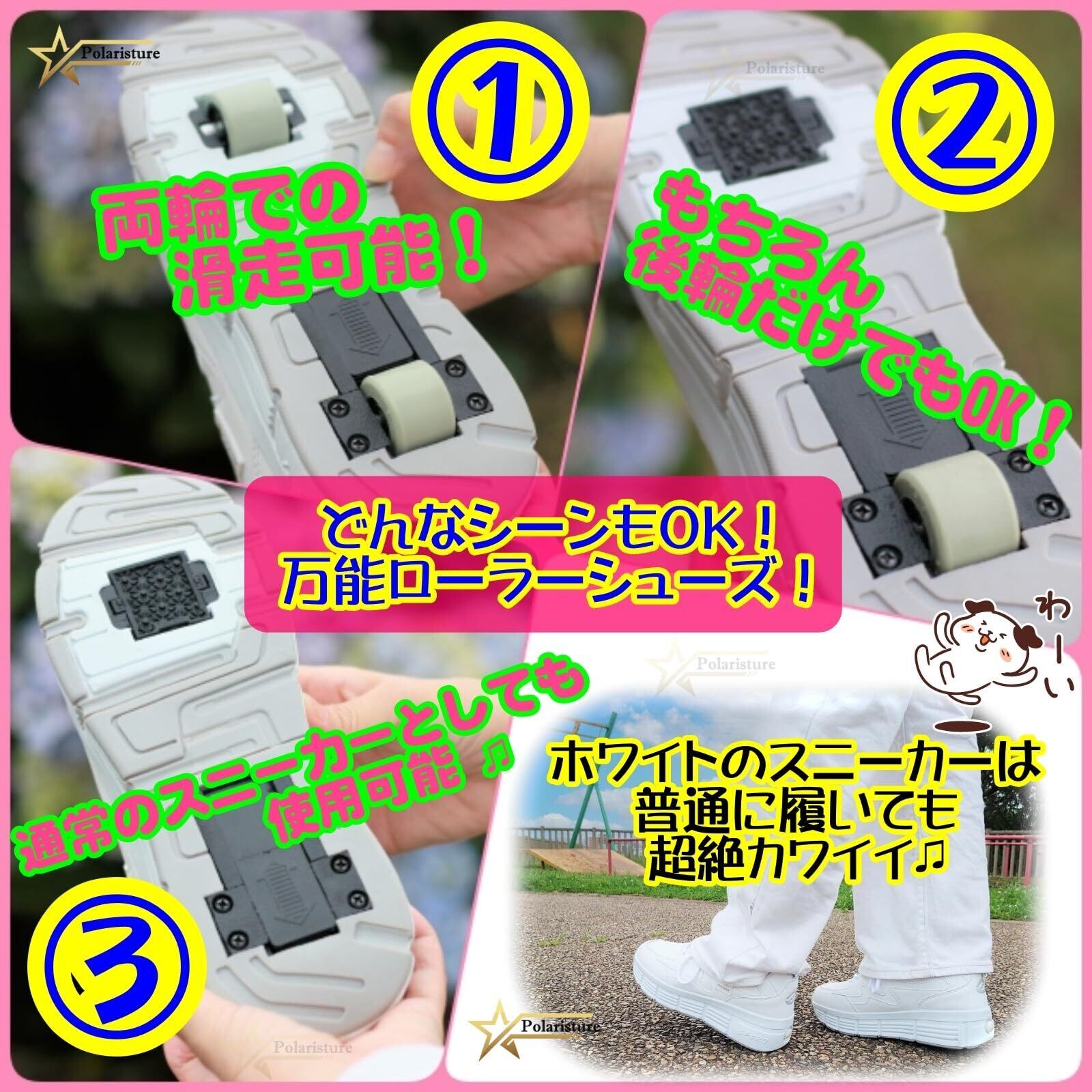 SNSで大バズり中のローラーシューズです。後輪ローラーは靴底に収納可能です。カカトのボタンを押したまま、ローラーを押せば収納できます。前輪ローラーは収納不可ですが、取り外しが可能です。付属のフタをはめ込めば通常履きのスポーツシューズとしても使用出来ます。 前輪+後輪の両輪式なので、ローラースケートやローラーブレードのようにスムーズに滑走が可能です。(段差には弱いのでご注意ください) サイズについては通常履きのサイズを選択していただければほぼ間違いありませんが、迷わるようでしたら0.5サイズ大きめのサイズをご選択ください。サイズは個人差がございますので何卒ご理解ください。 様々なプレゼントにも最適です。恋人や友人、子どもたちへの誕生日、ハロウィーン、クリスマスなどのプレゼントにいかがでしょうか。各種イベントで使用する事例も多く見られます。夏祭り、文化祭、ダンスショー、パーティー、とてもオシャレなデザインなので日常の運動靴としても使用できます。あらゆるシーンに最適なシューズです。 表地:合成皮革 ソール:TPR素材 車輪:PU 21cm-23.5cmはマジックテープ仕様、24cm-26cmは靴紐またはマジックテープ設計です。 滑走の際は路面状況と周囲の状況に常に気を配り、十分注意してください。人通りの多い場所で着用される際は車輪を収納してください。※はローラーシューズによる事故、お怪我などには一切の責任を負いませんので、ご使用に際しまして十分にご注意下さい。 ※掲載写真のお色などできる限り実物に近い表現を心がけておりますが、お客様の閲覧環境(パソコン機器及びモニタなどの違い)、また室内、室外での撮影により、多少色味が異なって見える場合がございます。ご了承ください。 ※海外生産のため、形やサイズに多少の誤差が生じる場合や、キズや汚れがある場合がございます。品質上はまったく問題はございませんので、予めご理解下さいますようお願い申し上げます。