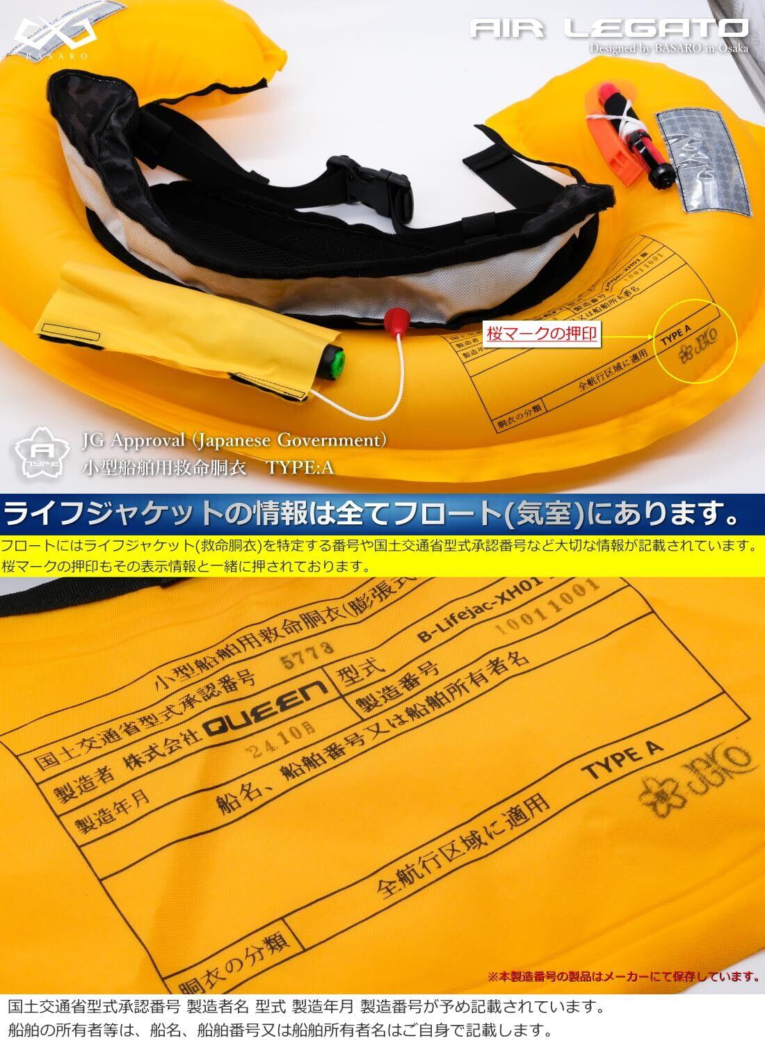 桜マーク付きライフジャケットは全数、日本国内にてメーカー検品を行なっております。またメーカー検品後には必ず政府系認証機関と共同で、浮力・強度等の検査検定を行い品質に問題ないと判断された製品のみが世に出荷されます。最近では船舶問わず、桜マーク付きライフジャケットの着用が良いとされております。桜マーク付きライフジャケットに搭載されているボンベには製造年月が刻印されております。ボンベの交換時期は2−3年を目安に交換して下さい。この桜マーク付きライフジャケットは自動膨張式となっております為、ボンベ交換と同時に自動膨張用のスプールも交換して下さい。ボンベとスプールは必ずBASARO純正品をお買い求めください。純正品以外での動作検査・は一切行なっておりません為、ご注意下さい。