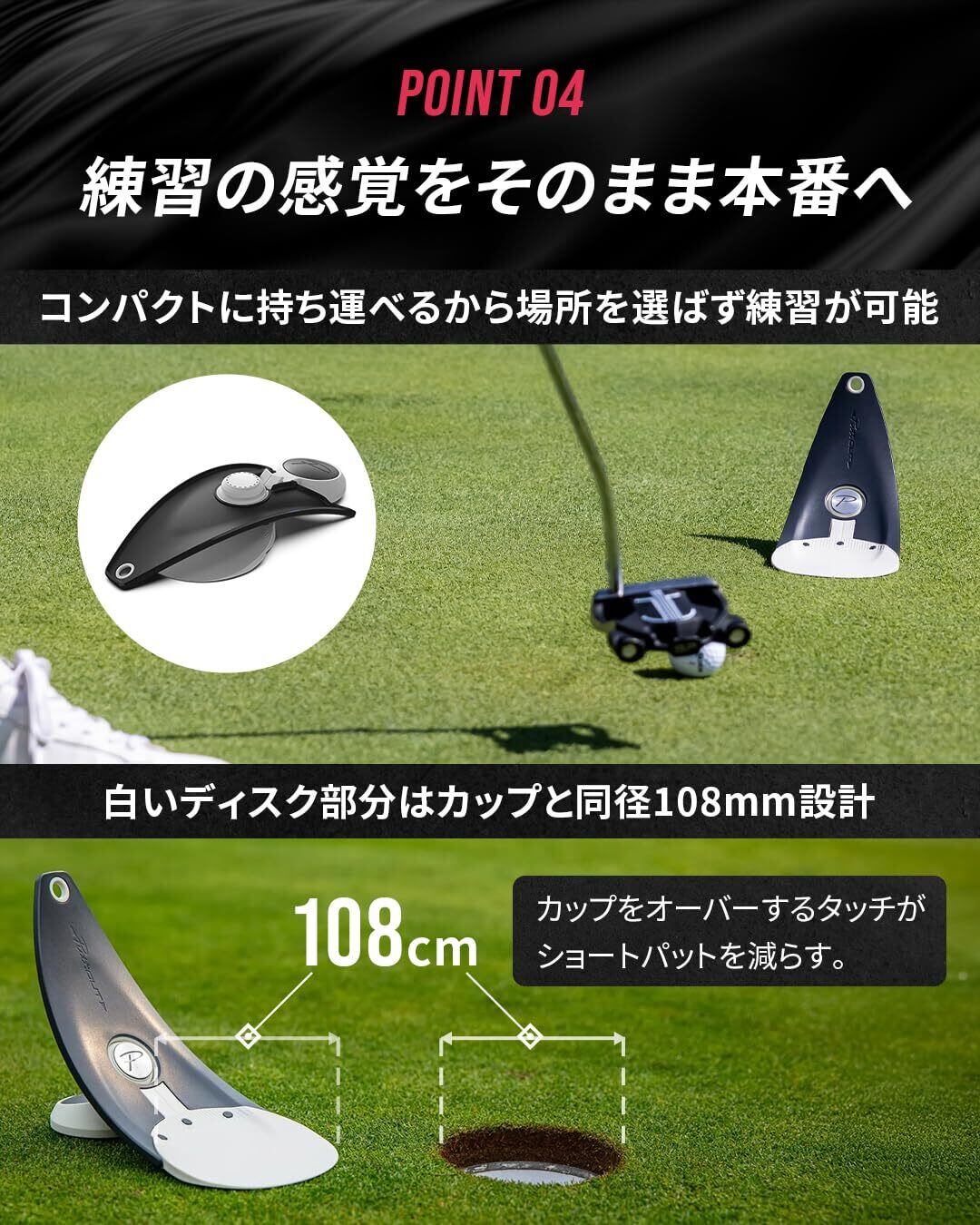 【カップと同じサイズのターゲット】ターゲットサイズは、実際のカップサイズと同じ設計でできています。そのため、練習で習得したパッティングのイメージを、そのまま本番で活用できるゴルフ練習器具です。またターゲットには、3つのドット(目印)が付いており、精密なコントロール力を養えるのも特徴です。
