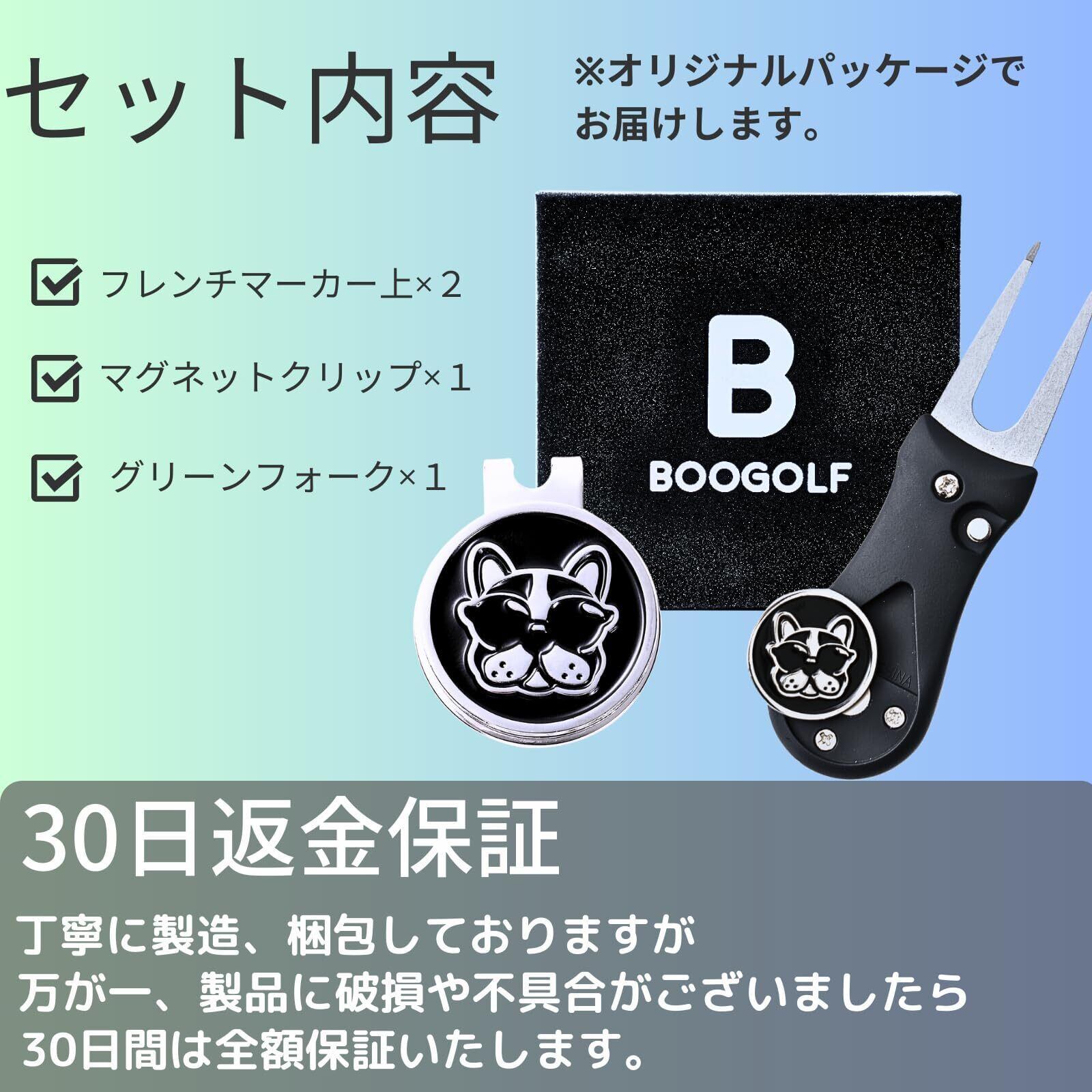 フレンチブルドッグデザインのマグネット式ゴルフマーカーとグリーンフォークのセットで、軽量設計のためラウンド中にも使用しやすい商品です。