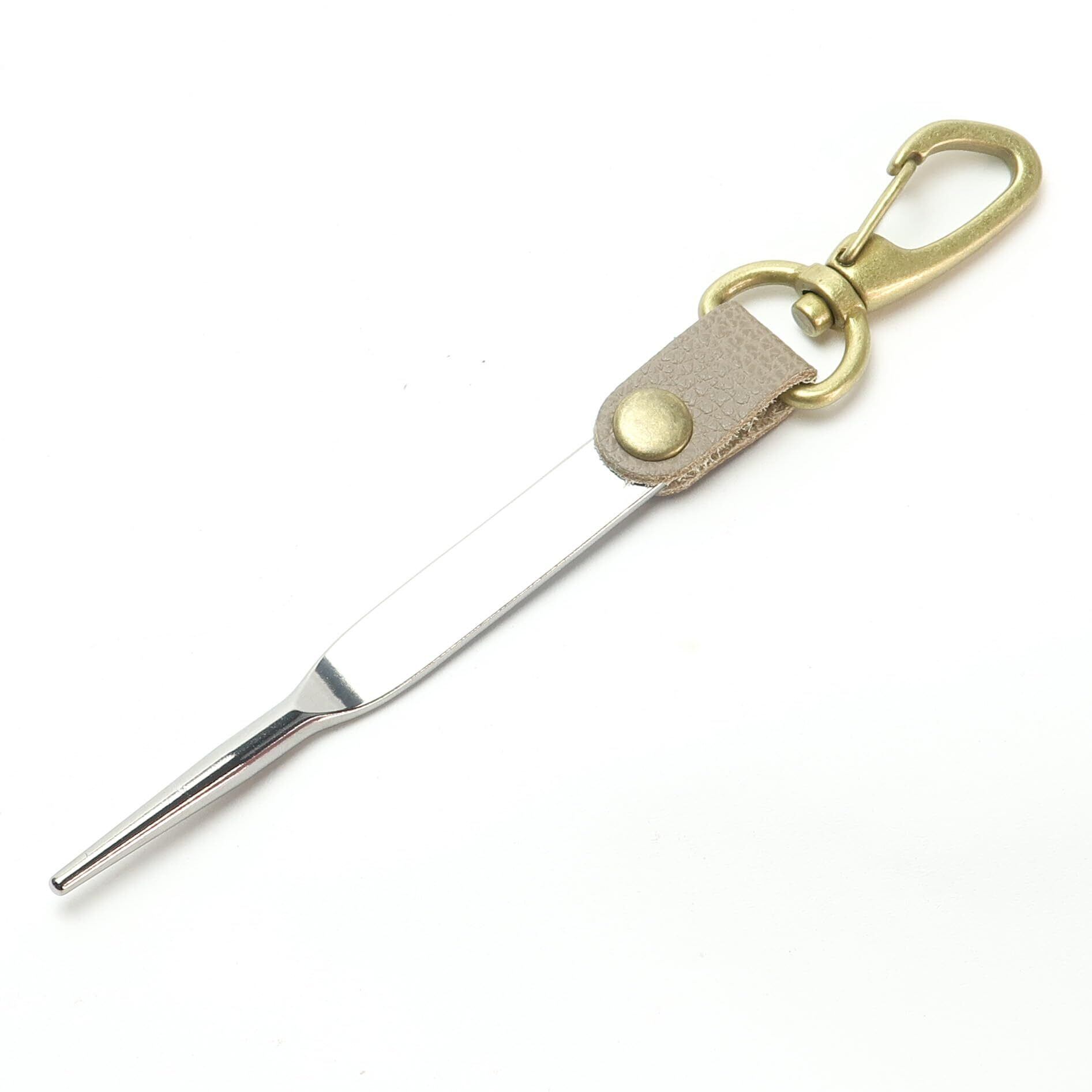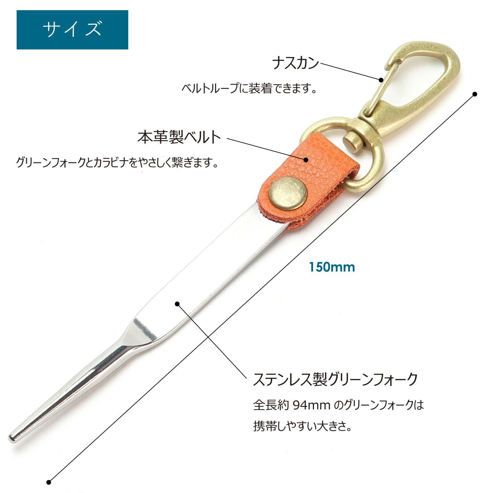 ステンレス製のグリーンフォークに真鍮製カラビナを本革ベルトで繋ぎました。 全長約95mmと他のグリーンフォークよりコンパクトで携帯しやすい。 製造は信頼の新潟県燕市のカトラリーメーカー。