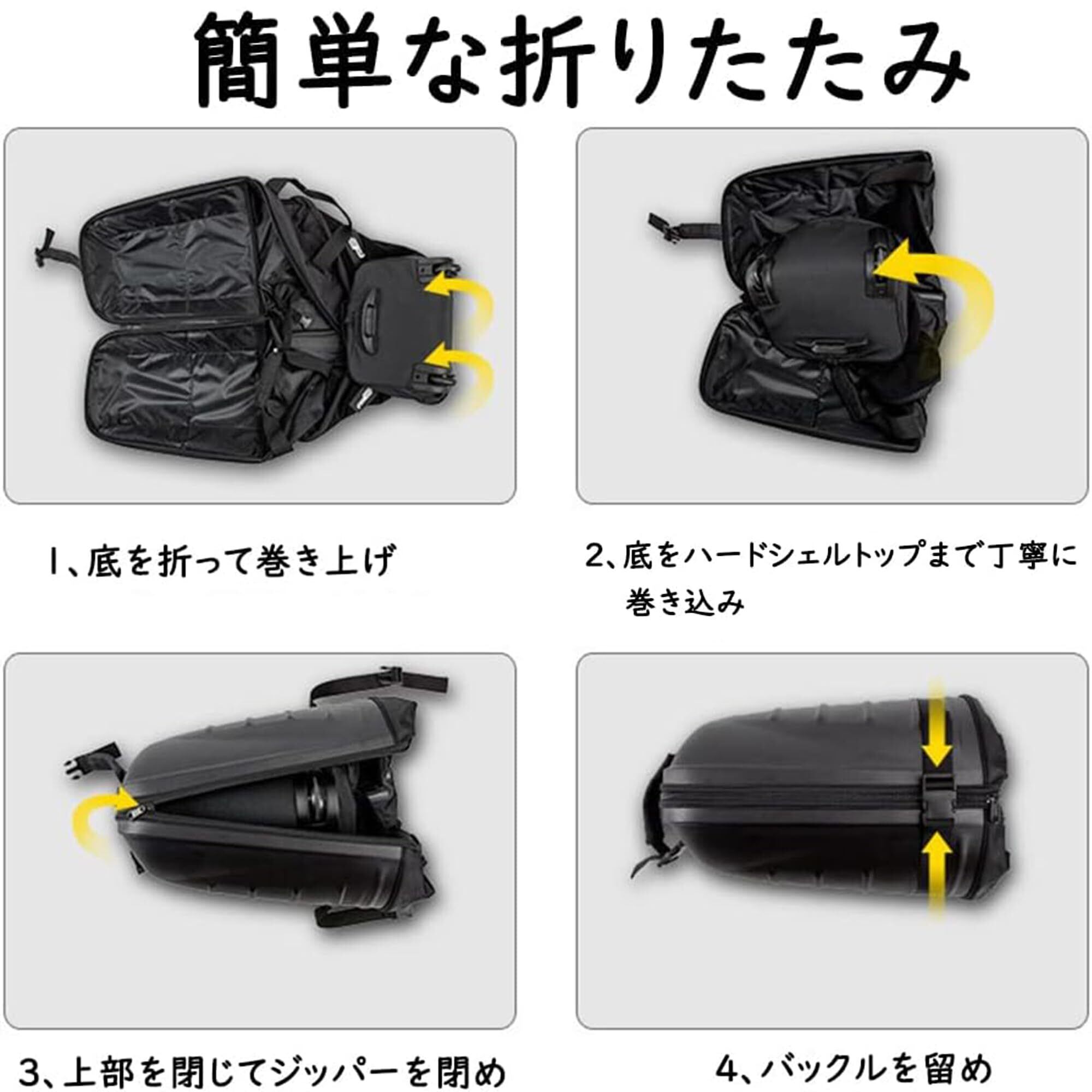 【折り畳み方式】まず、底を折って巻き上げ、底をハードシェルトップまで丁寧に巻き込みます。そして、ハードシェルトップを閉じてジッパーを閉め、バックルを留めて完了です。