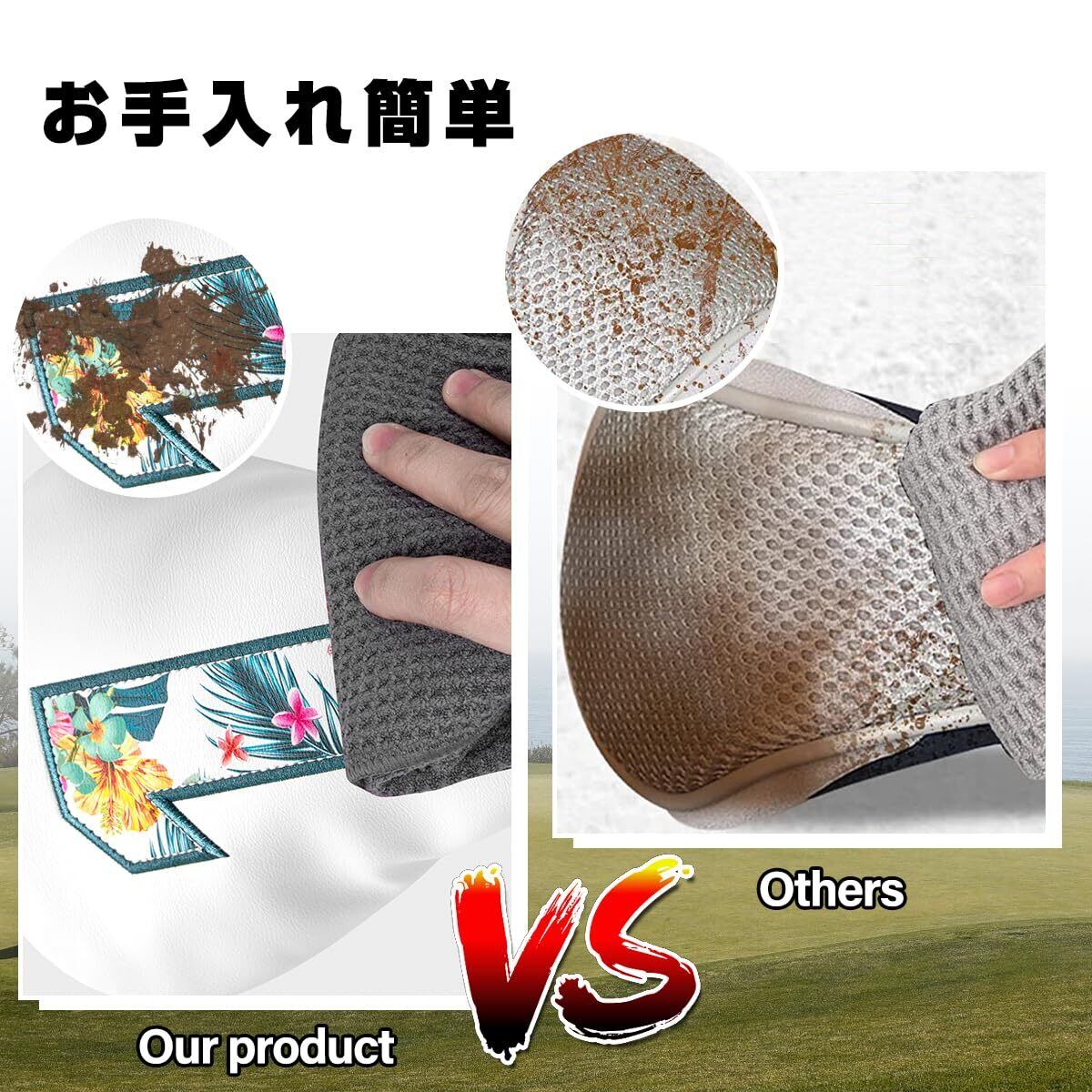 【高品質な素材】:ゴルフヘッドカバーは高品質な素材を採用しております。表地は耐磨耗性の良い合成皮革(PUレザー)で、耐久性が良くて、長持ちです。更に、防水で、うっかりで雨に降られても心配なしで、汚れなどでも気軽に拭き取れます。内側のボアも厚めにし、肉厚のあるしっかりした作りで大切なゴルフクラブをキズから守れます。