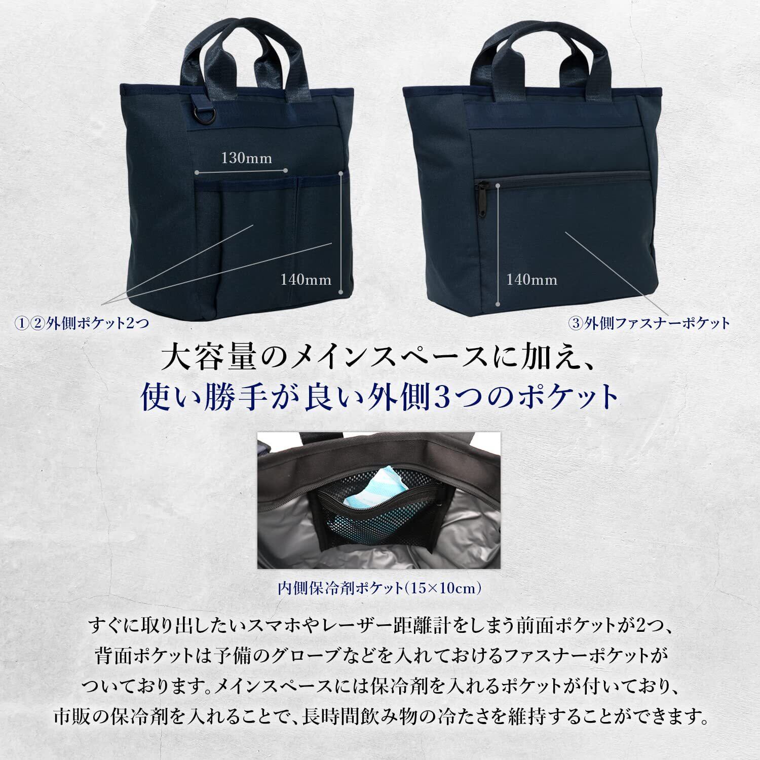 【通勤や通学のランチバッグとしても使える】500ml用水筒やお弁当箱、ウェットティッシュなど、ランチに必要な荷物を入れてもまだまだ十分余裕があるバッグとなります。内側の生地には保冷バッグで定番の素材「PEVA」を使用し、外生地と内生地の間に断熱性と保冷性に優れた発泡ポリエチレンを採用しておりますので、市販の保冷剤を入れておくことで長時間冷たさをキープしてくれます。(※常温の飲食物をを冷たくする仕様ではありません。)もちろん夏場の暑~いゴルフでも、冷たい飲み物やひんやりタオルを入れておけば、大活躍してくれることでしょう。