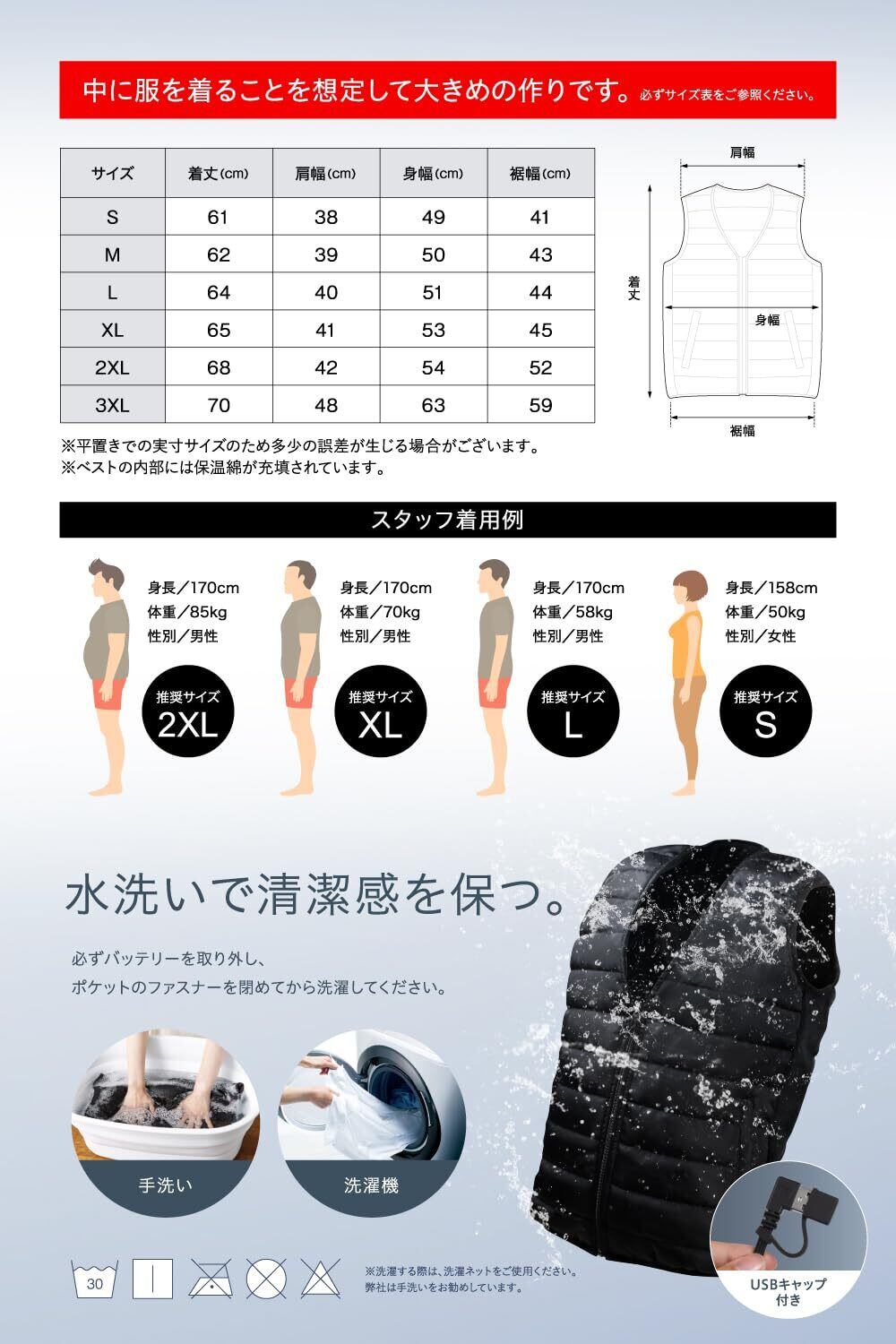 Lサイズ️画像のサイズ表をご参考に、サイズをお選びください。 【素材構成】表面:ポリエステル100%/裏面 : ポリエステル95% ・ポリウレタン5%/中綿:ポリエステル100% ※本製品には、ACアダプターは付属しておりません。 【前後12箇所加熱ベスト/3段階温度調整可能】約3秒※で発熱スタート。前面・背面の2箇所から温めたい部分を選択可能。 赤ランプ=高温(約65℃※)/白ランプ=中温(約50℃※)/青ランプ=低温(約45℃※)の3段階で温度調整でき、 ボタンの色で温度段階が一目で分かります。 ※自社試験(室温20℃環境)による参考値です。使用環境・設定により異なります。