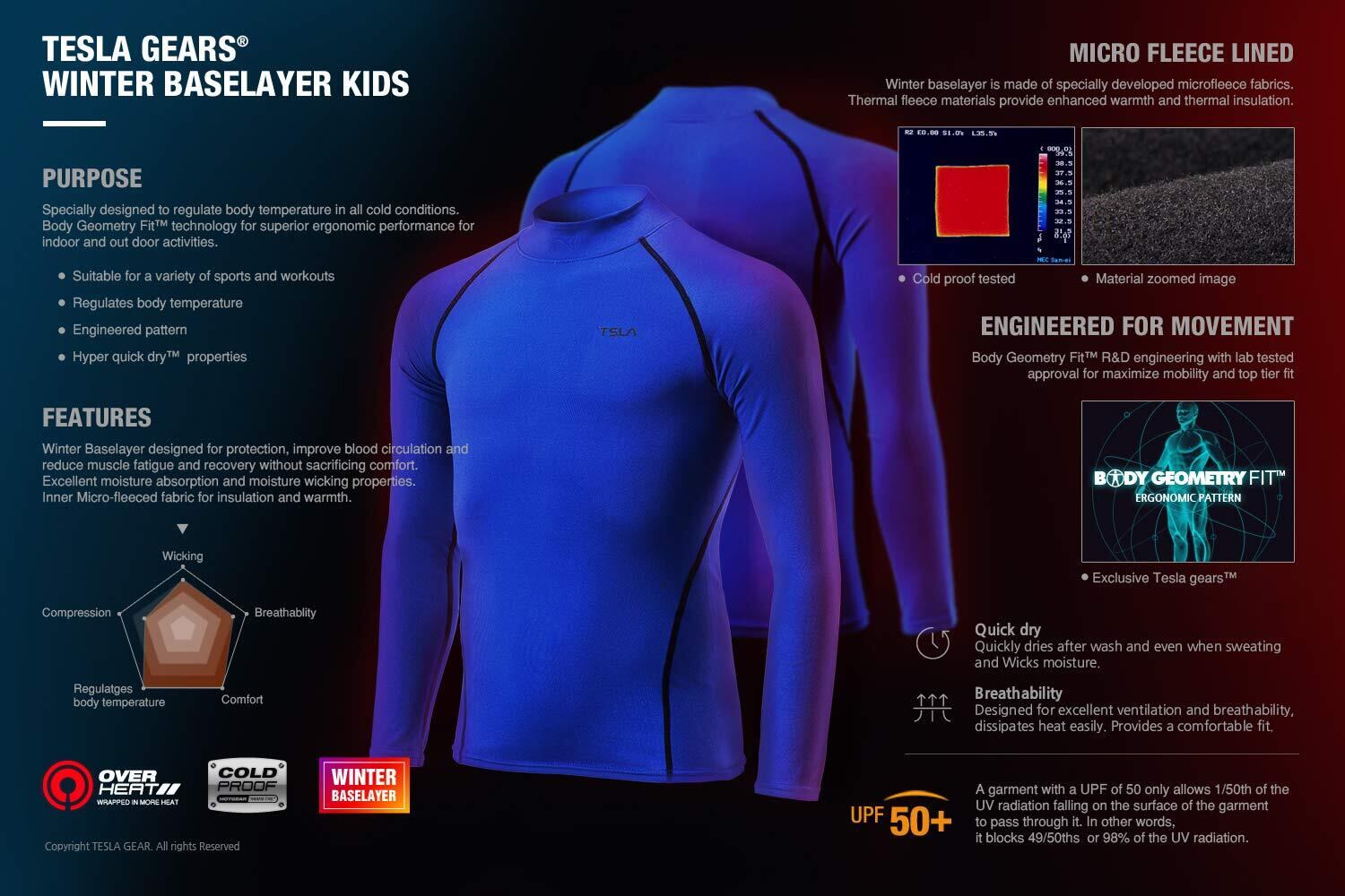 [テスラ] キッズ 裏起毛 コンプレッション 冬用 防寒インナー ジュニア 長袖トップス/ロングタイツ 選べる スポーツインナー サッカー 野球 スキー 通学・部活 秋冬