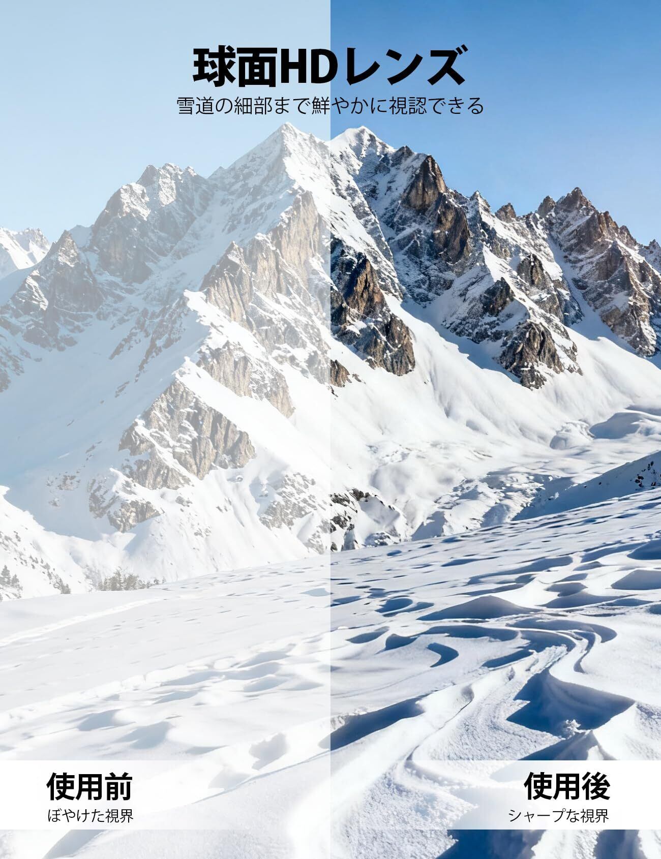 【UV400カットHDレンズ】スキーゴーグルはクリアな視界を保ち、瞳を紫外線から守るために必要なアイテムです。このスノボーゴーグルのレンズには、防眩コーティングが採用され、100%のUV カット、有害な紫外線を完全に遮断。目を守りつつ高い光線透明性を提供します。紫外線による目への影響を低減。ゴーグルはHDレンズを使用して、透明度を増やし、強い色調により対象物とのコントラストを明確にし、ものを鮮やかに見えます。雪道の細部まで鮮明に視認でき、快適な滑走をサポートします。
