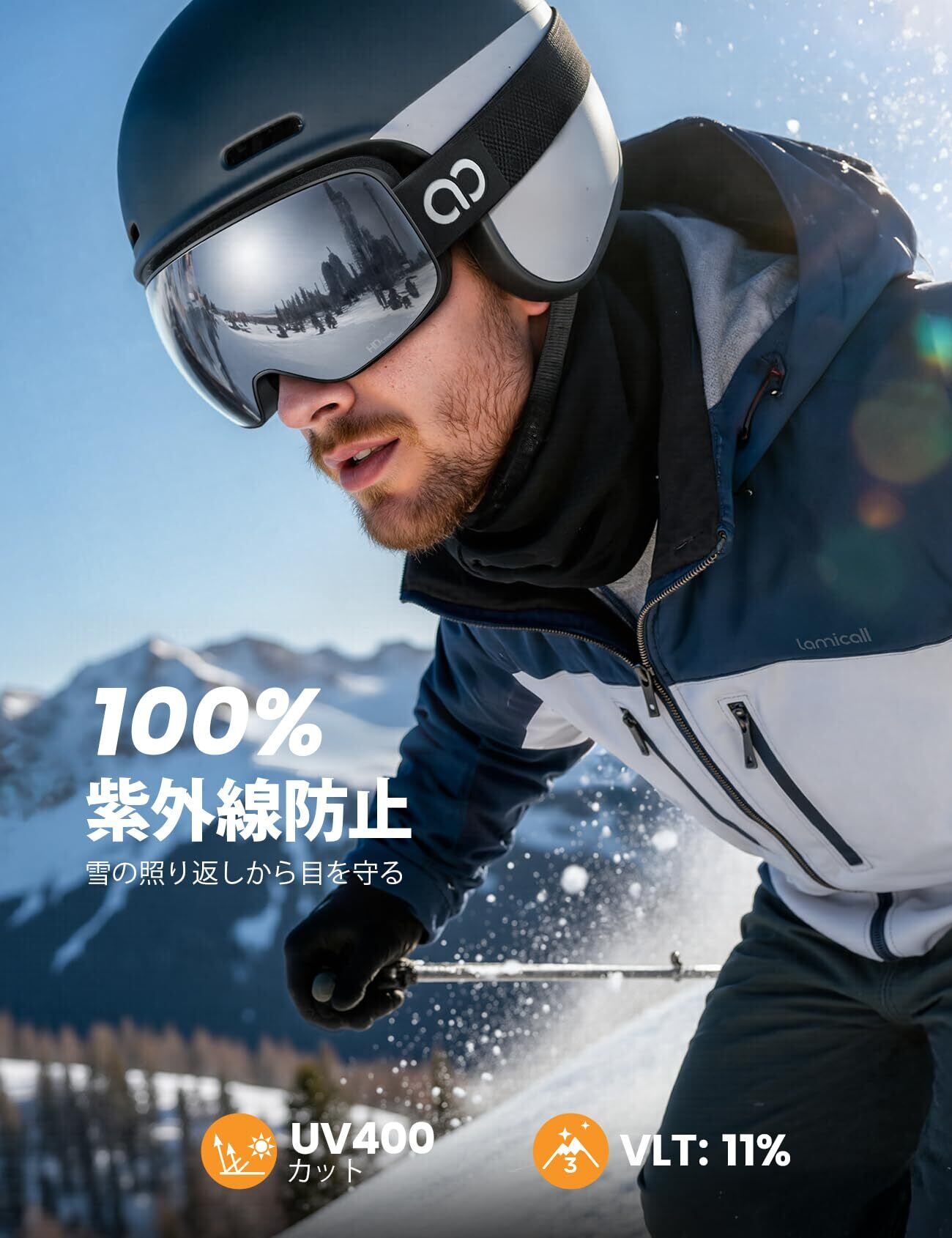 [Lamicall] スキーゴーグル 【三重防曇・フレームレス構造】 スノーゴーグル スノーボードゴーグル OTG 眼鏡対応 広視野角 球面レンズ UV400保護 曇り止め ダブルレンズ ヘルメット対応 軽量 耐衝撃 防風/防雪/晴れ/曇り/全天候対応 ジュニア レディース メンズ 男女兼用