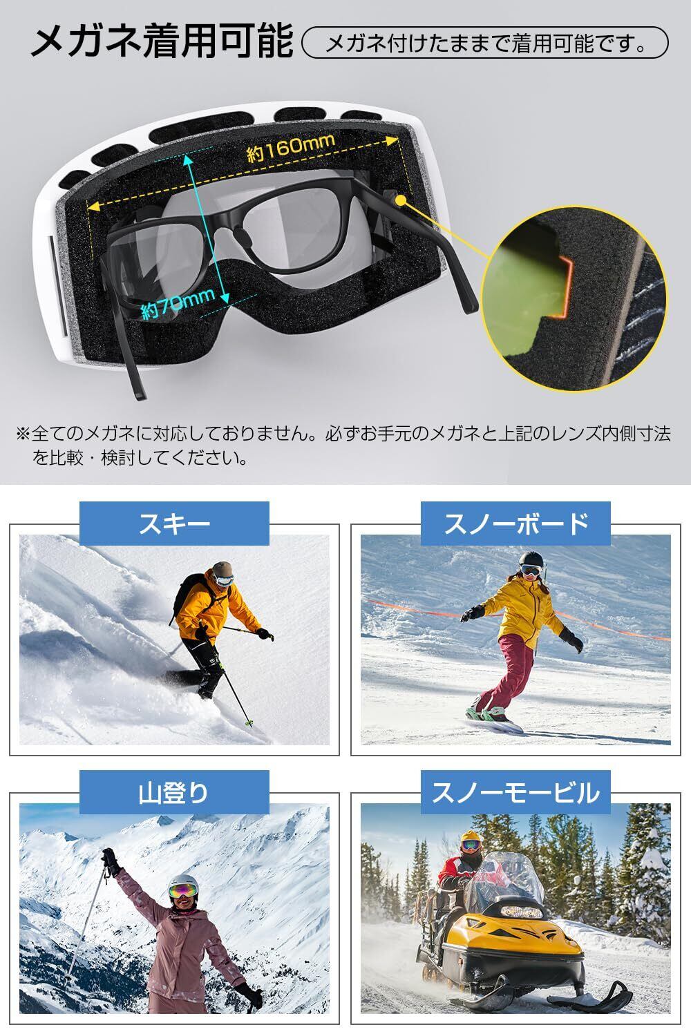 【メガネ対応・ヘルメット対応】このスキーゴーグルは内部容積を大きく設計されており、裏側のスポンジにメガネの掛け部があり、違和感なく装着可能です。幅 16cm× 高 7cm 以内のメガネに対応し、近視の方にも配慮されています。さらに、2 つのアジャスターと高弾性ベルトを使って、約 45cm から 80cm の周囲に対応しています。ヘルメットとも簡単に着用できます。ベルトは滑り止めデザインなので、ゴーグルのズレや落としを心配する必要はありません。