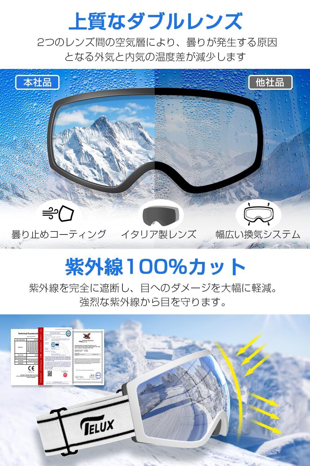 【3重曇り止め効果】イタリア製レンズを採用したスキーゴーグルは、3重曇り止め効果を発揮します。まず、2つのレンズの間にある空気層により、レンズ内外の温度差を減少させ、曇りが発生する原因を抑えます。そして、ゴーグルの上部と下部には通気口が設けられており、ゴーグル内部の空気を流れさせて温度差を減らし、曇りを防止します。さらに、レンズ内側には曇り止めコーティングが施されており、レンズ面に垂らした水滴が表面に留まりにくくなっています。