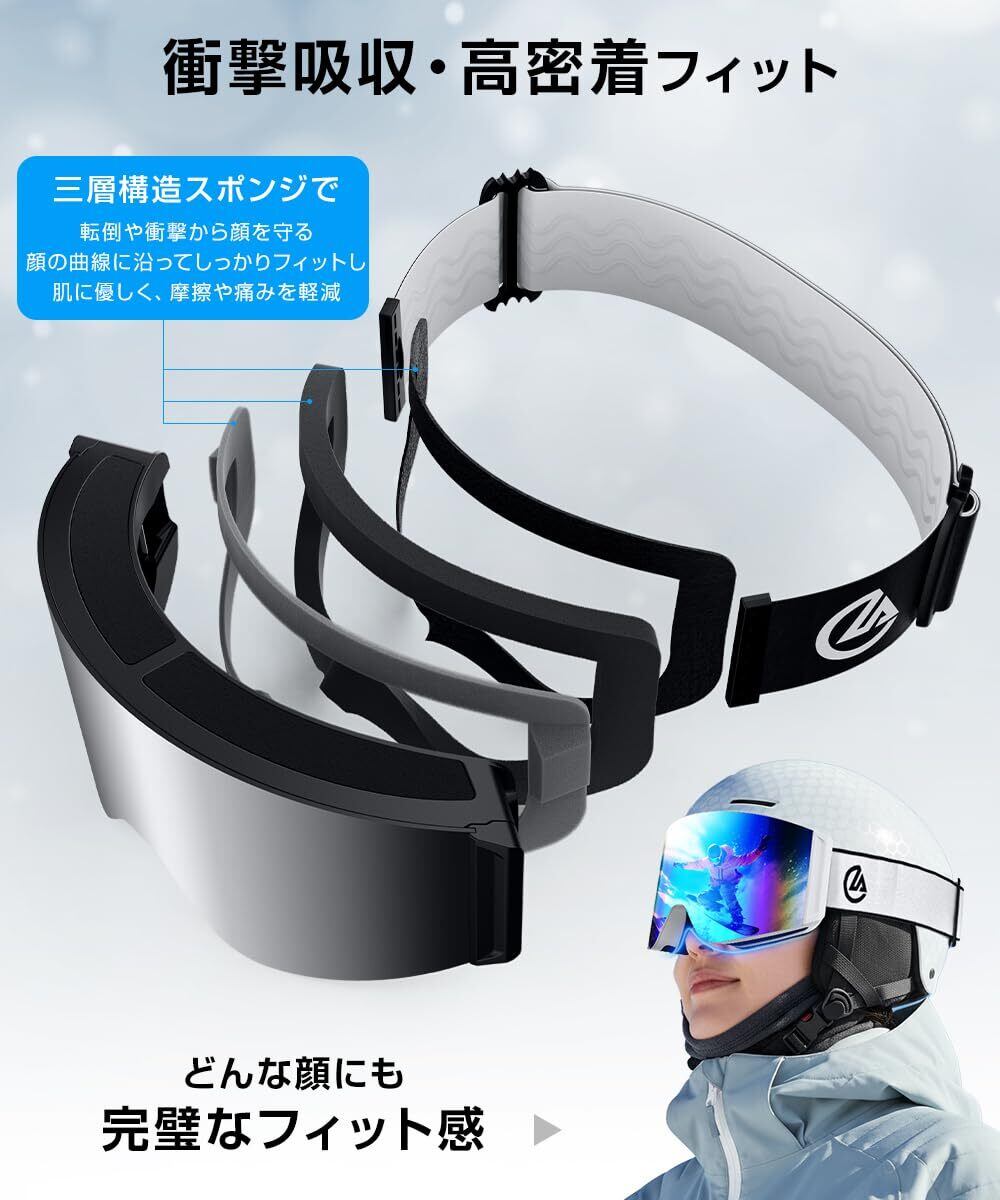 ④【UV400カット×防風・防雪設計】スキーゴーグル レディース メンズ】スキーゴーグル 偏光 UV400で紫外線とミラーレンズ 雪面反射光をしっかりカットし、目を保護。フィット感の高い3層スポンジが顔に優しく密着し、冷気・風・雪の侵入を防止。長時間使用でも痛くなりにくく、ジュニアから大人まで幅広く使える男女兼用モデル。