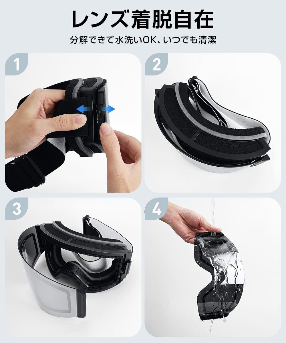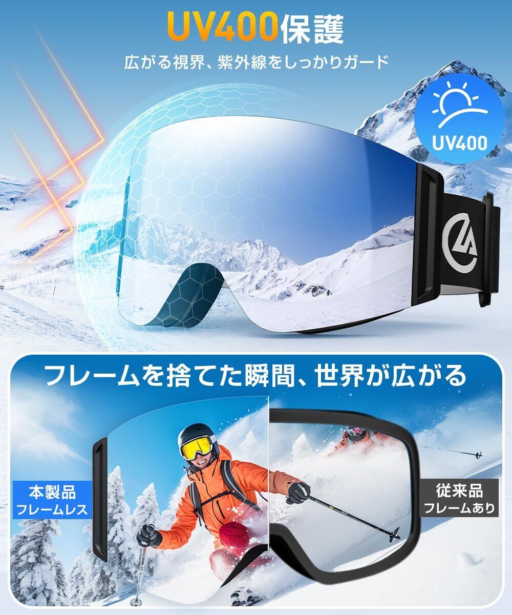 ①【フレームレス広視界×レンズ着脱構造】スキーゴーグル メンズ レディース フレームレス設計により、視界の遮りを最小限に抑え、ゲレンデ全体を見渡せる広視界を実現。レンズはワンタッチで着脱OK、前面から簡単に取り外せる構造で、内部の湿気を素早く放出し乾燥性が向上。使用後の水分・雪を素早く乾かせるため、曇り・カビ・ニオイの発生を防ぐメンテナンス性抜群のスノボ ゴーグル。男女兼用・ジュニアにも最適。