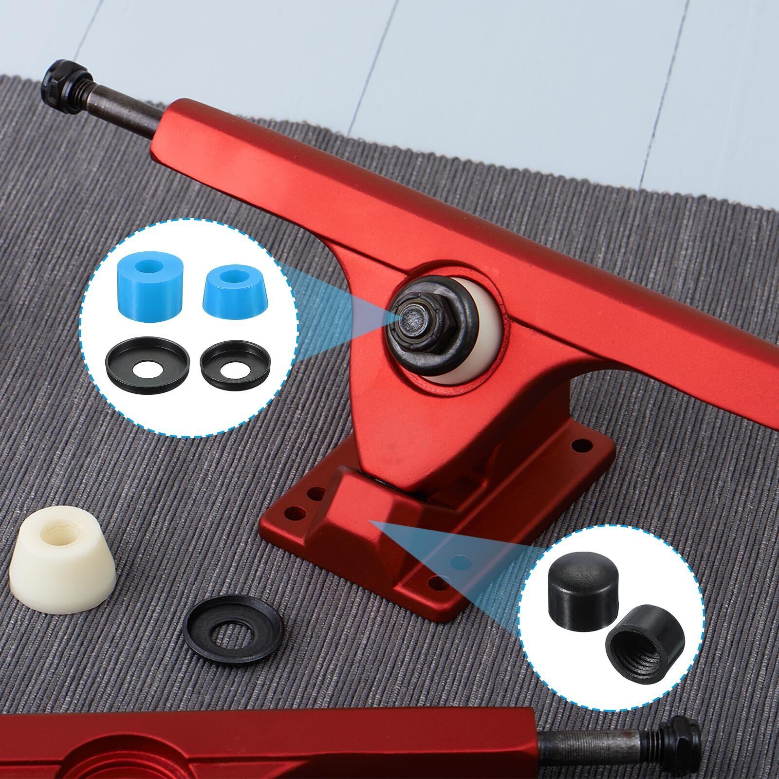 用途 - スケートボード ブッシングは、ほとんどのスケートボードに適しています。古くてひびの入ったスケートボード ブッシングをこれに交換して、ロングボード/スクーターの柔軟性を維持できます。スケートボード トラッ ク ライナーは、バランスの取り方を習得し、よりスムーズでコントロールされたライディングができるようにするのに役立ちます。