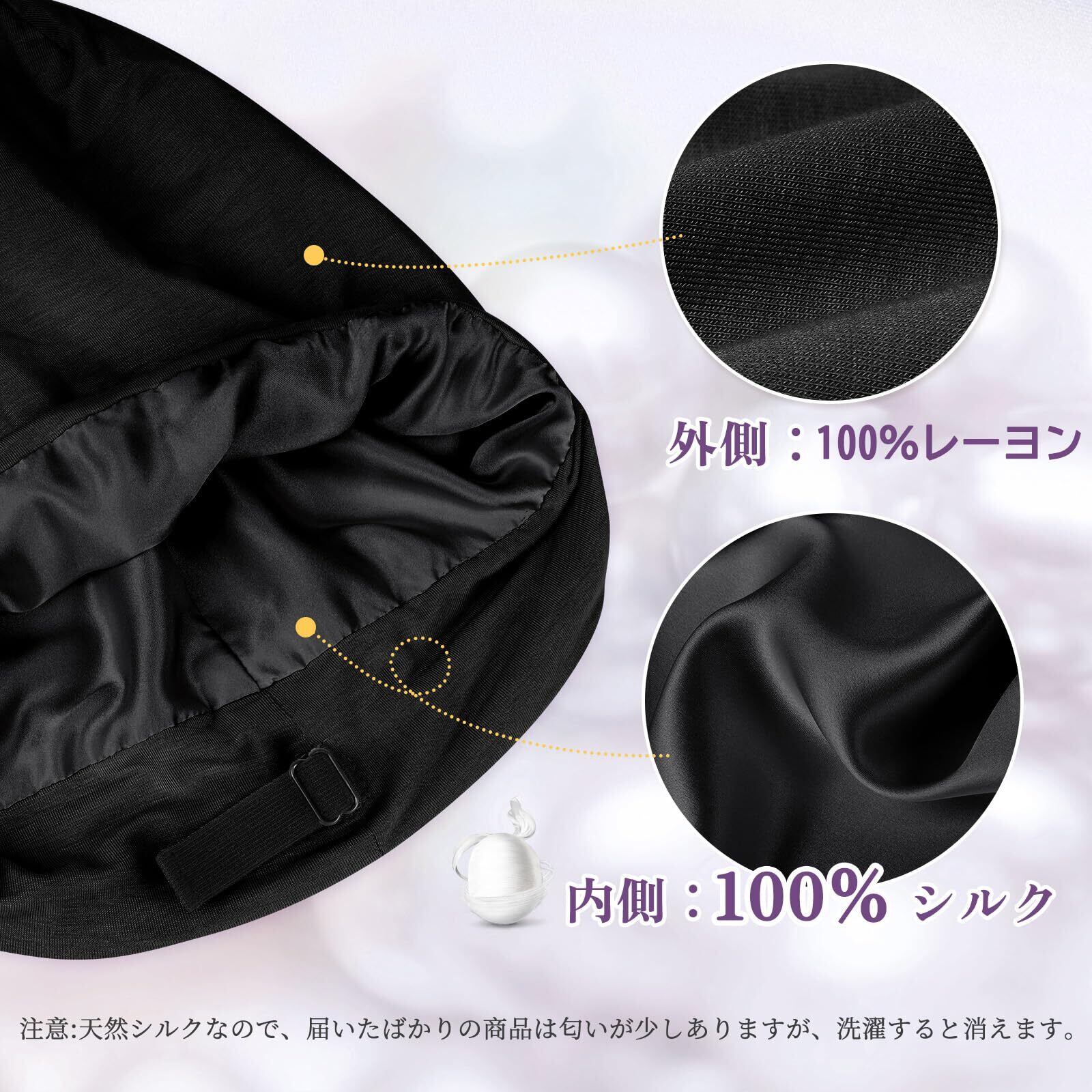 【シルクナイトキャップ】フリーサイズ 縦:30cm, 横幅:28cm 内側には上質なシルク、外側にはレーヨンの男女兼用のシルクナイトキャップです。男性にも、女性にも年齢にも限らず、家族で使いまわしもできます。 どんなシーンも使いたい高級な贈り物です。注意:裏地の色はブラックとグレーの2色があり、ランダムにお客様にお送りします。天然シルクなので、届いたばかりの商品は匂いが少しありますが、洗濯すると消えます。